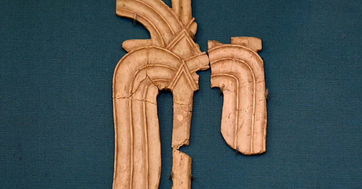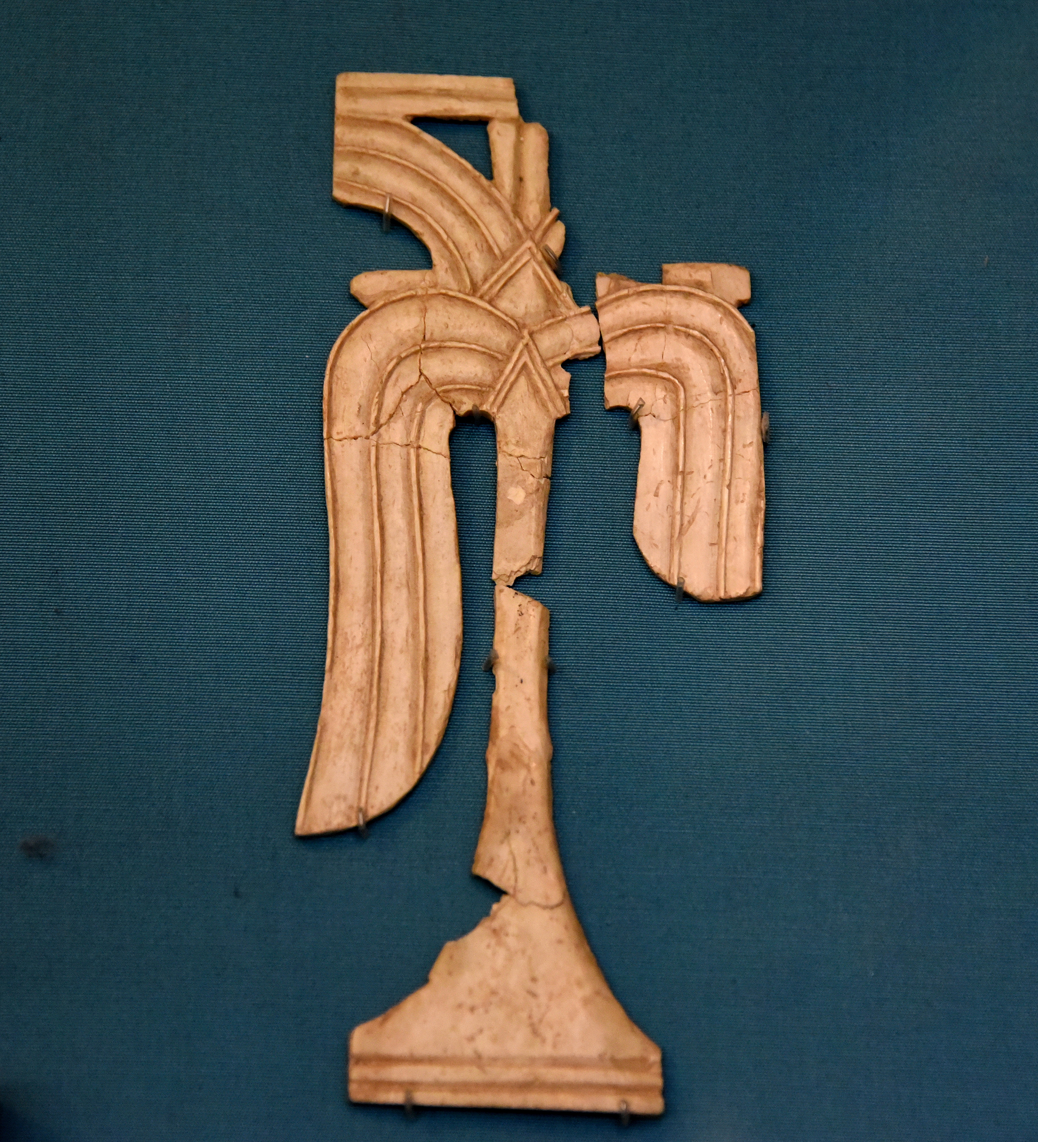 This carved piece of ivory, in a Phoenician style, is part of large number of ivories which were found in the city of Samaria during the excavations of J. W. Crowfoot in 1931-1935 CE. They consist, for the most part, of furniture inlays, and although they were not recovered from rooms of the palace, but from rubbish pits near its enclosing wall, it would be reasonable to associate them with the Biblical traditions of Ahab's "Ivory House" (I King, xxii, 39). From Samaria, modern-day Israel. Lent by the Palestine Exploration Fund. (British Museum in London)