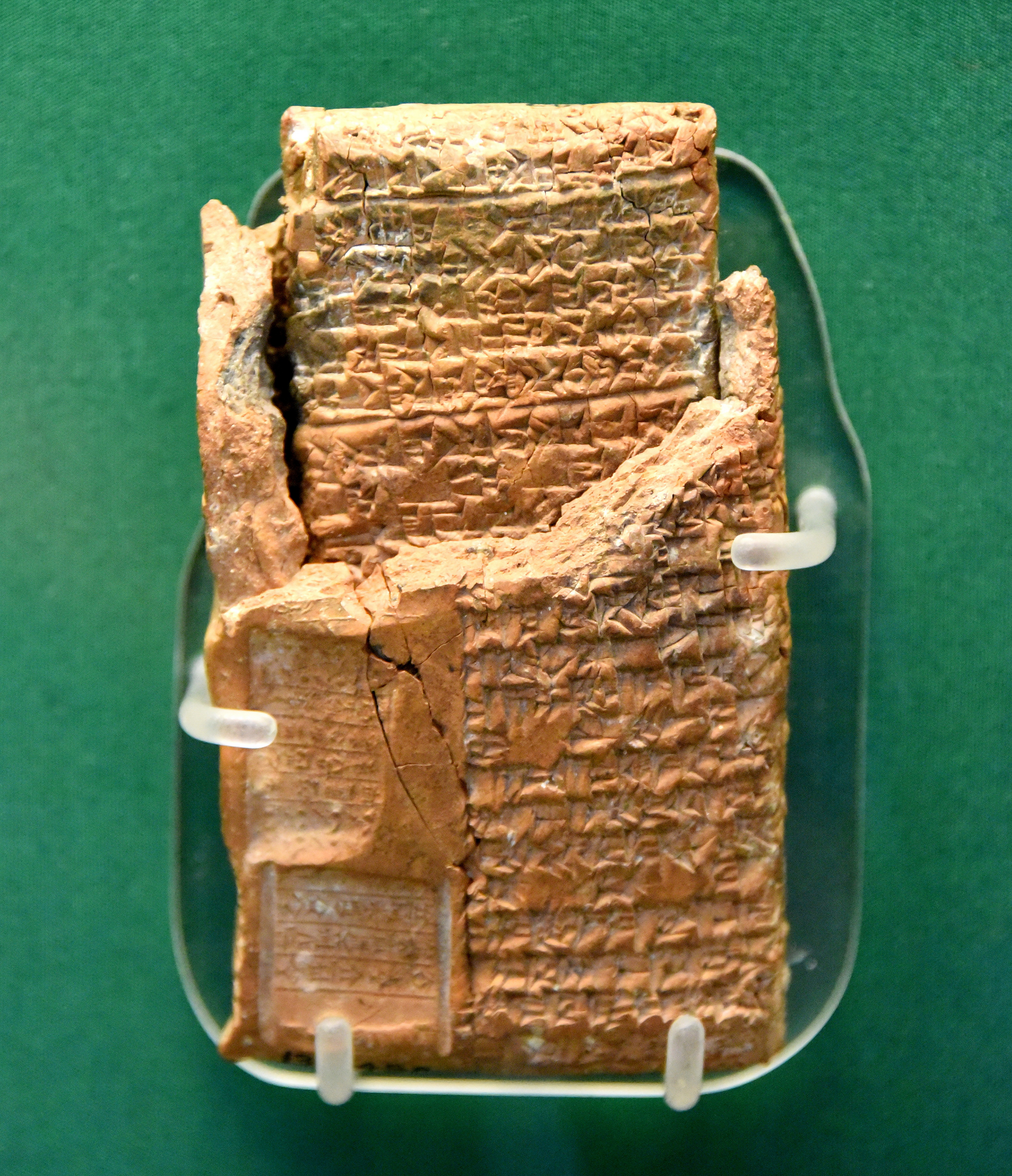 This clay tablet still has its clay envelope. The tablet mentions a legal case before Niqmepuh, King of Iamhad (Aleppo) concerning the legacy of two houses. The seal impressions of ten witnesses (including the King) survive on the fragmentary envelope. Grooves framing some impressions were made by metal caps, probably of gold. Circa 1720 BCE. From Level VII Palace at Tell Atchana, modern-day Hatay Province, Turkey. (The British Museum, London)