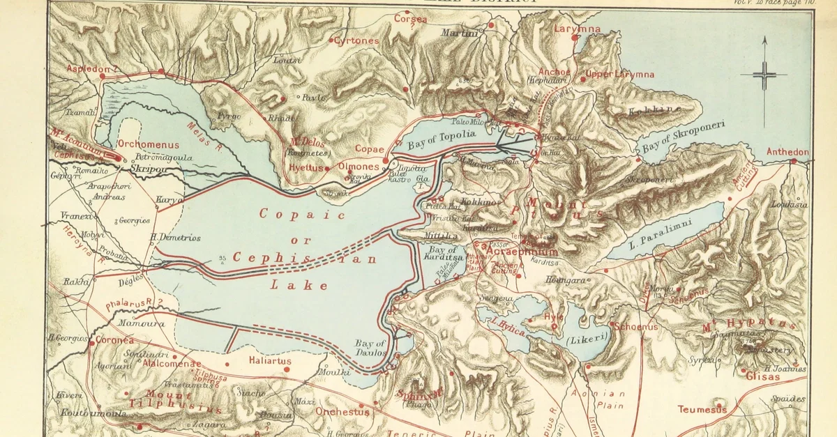 Map epicting locations described in Pausanias' Description of Greece, as found in the version translated and with a commentary by J. G. Frazer. Photograph by the British Library.