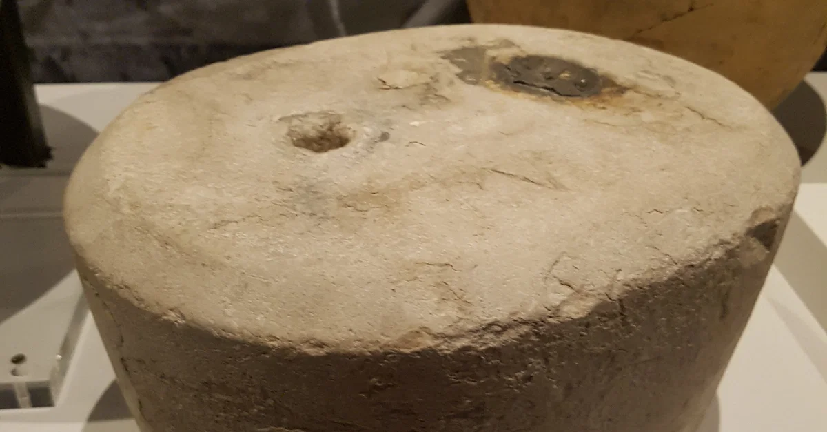 A Centussis weight used to weigh the cargo for sale. The stone is inscribed with an 'M' for Magister Navis, the ship's master and the initials 'TRVF', possibly for his name - either Titus Rufius or Titus Rufrenius. The two holes on the upper surface are where the handle was attached. From the Commachio Shipwreck (25-1 BCE). Museo della Nave di Comacchio, (photo taken at the National Maritime Museum, Sydney, Australia)