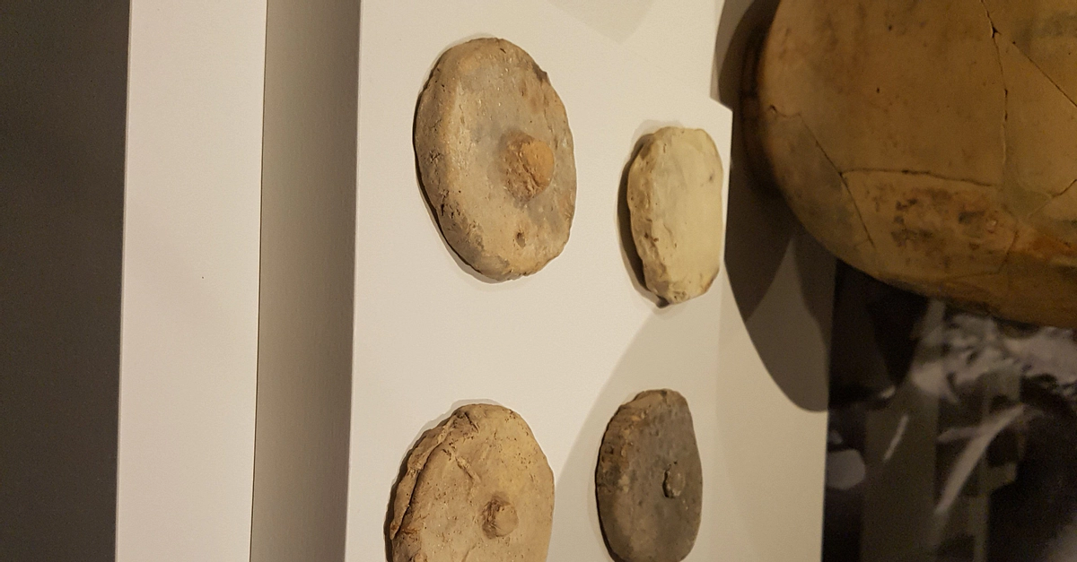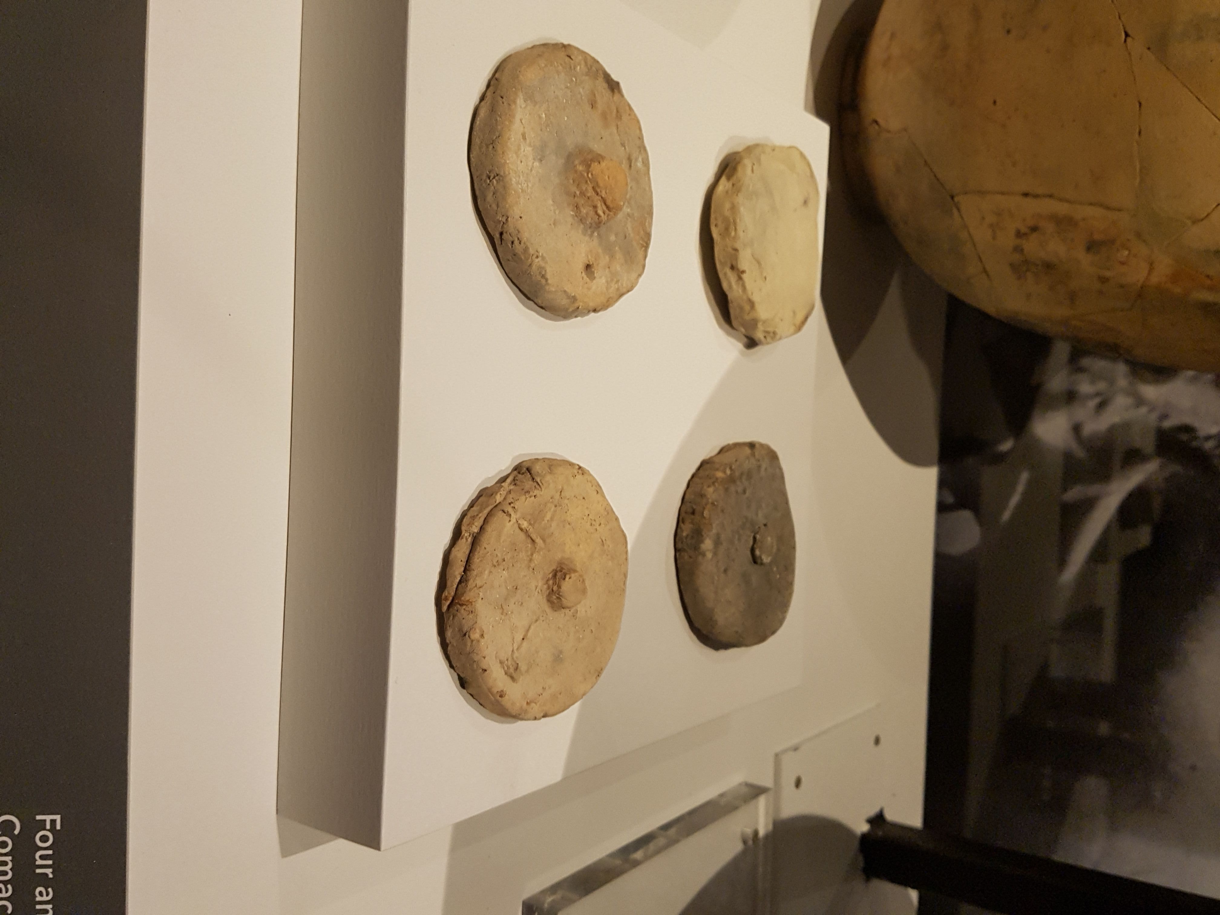 Four ceramic amphora stoppers from the Comacchio Shipwreck. 25-1 BCE. Museo della Nave di Comacchio, (photo taken at the National Maritime Museum, Sydney, Australia)