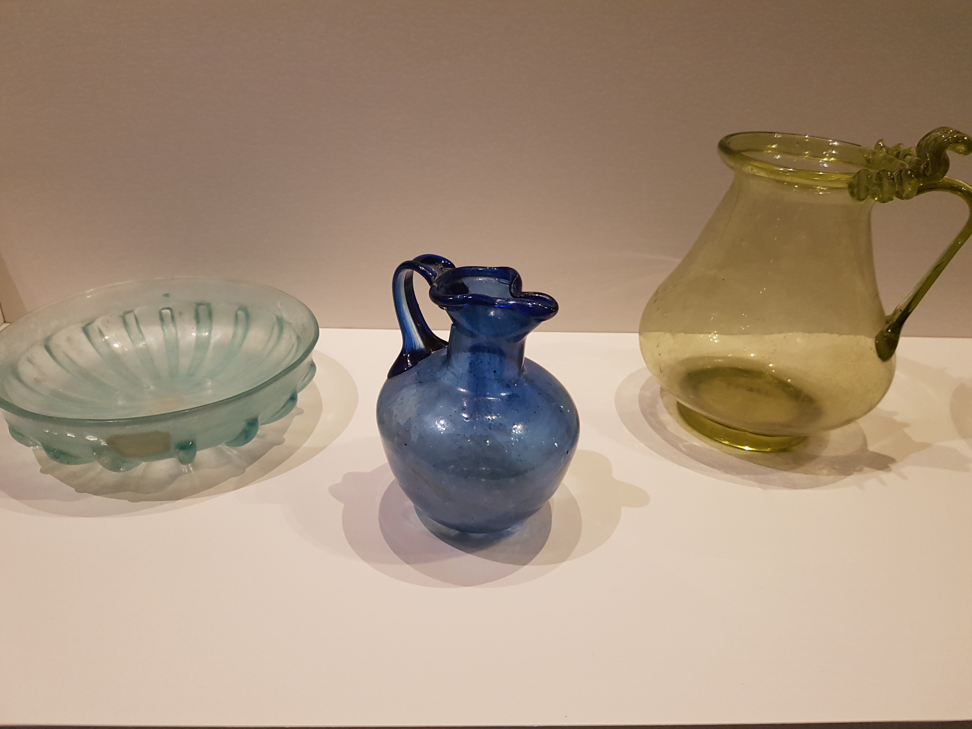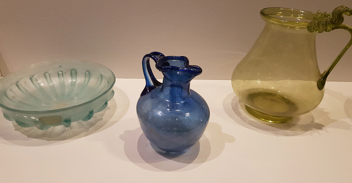 Two glass pitchers and a bowl from Pompeii. 1st century CE. Soprintendenza Archeologica di Pompei, (photo taken at the National Maritime Museum, Sydney, Australia)