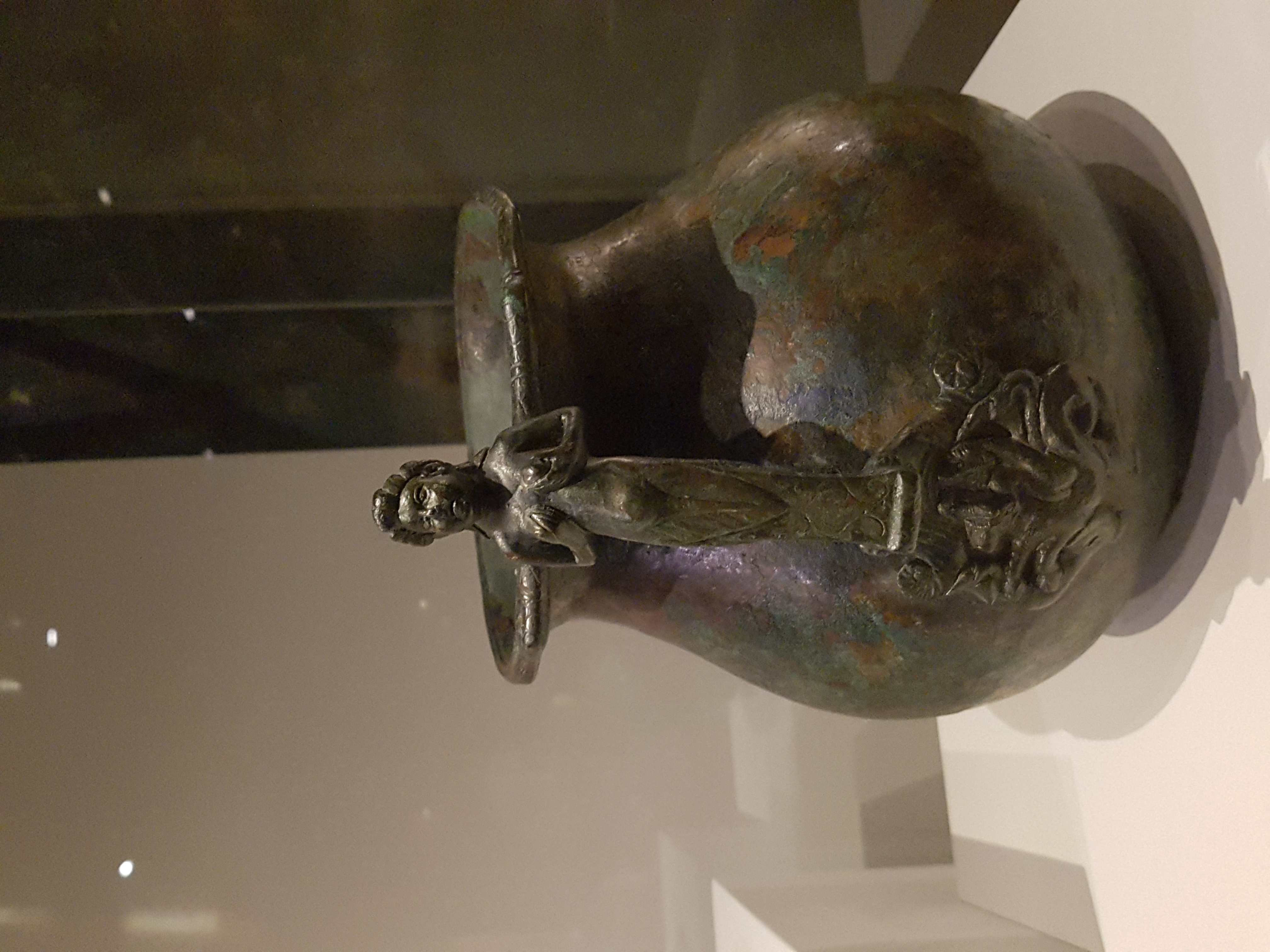 A bronze pitcher with Nereid (sea nymph). 1st century CE. Soprintendenza Archeologica di Pompei, (photo taken at the National Maritime Museum, Sydney Australia) Utensils for serving food were another way of showing your wealth. This bronze pitcher, used for adding water to wine, has a decorated handle of a nereid on a sea monster.