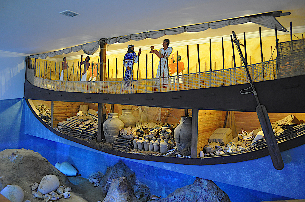 A reconstruction of the interior of the Bronze Age Uluburun shipwreck, 1330-1300 BCE. The ship sank off the coast of Lycia and contained, amongst other cargo, ten tons of copper ingots, tin ingots and jars of resin and foodstuffs. (Bodrum Museum of Underwater Archaeology, Turkey)