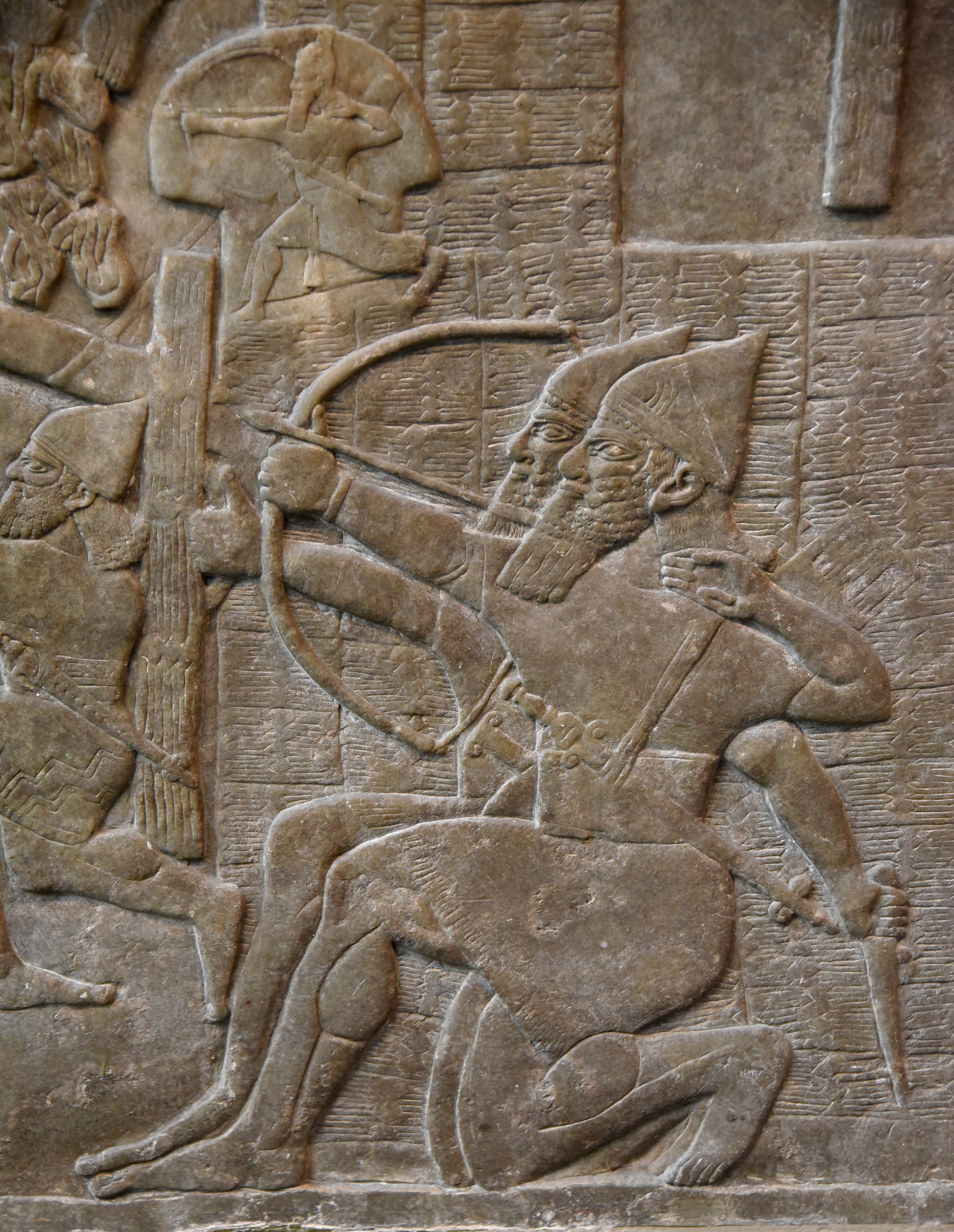 Alabaster bas-relief depicting Assyrian archers attacking a city. Neo-Assyrian Period, 865-860 BCE. Detail of Panel 4 (bottom), Room B, the North-Palace Palace, Nimrud, modern-day Iraq. (The British Museum, London)