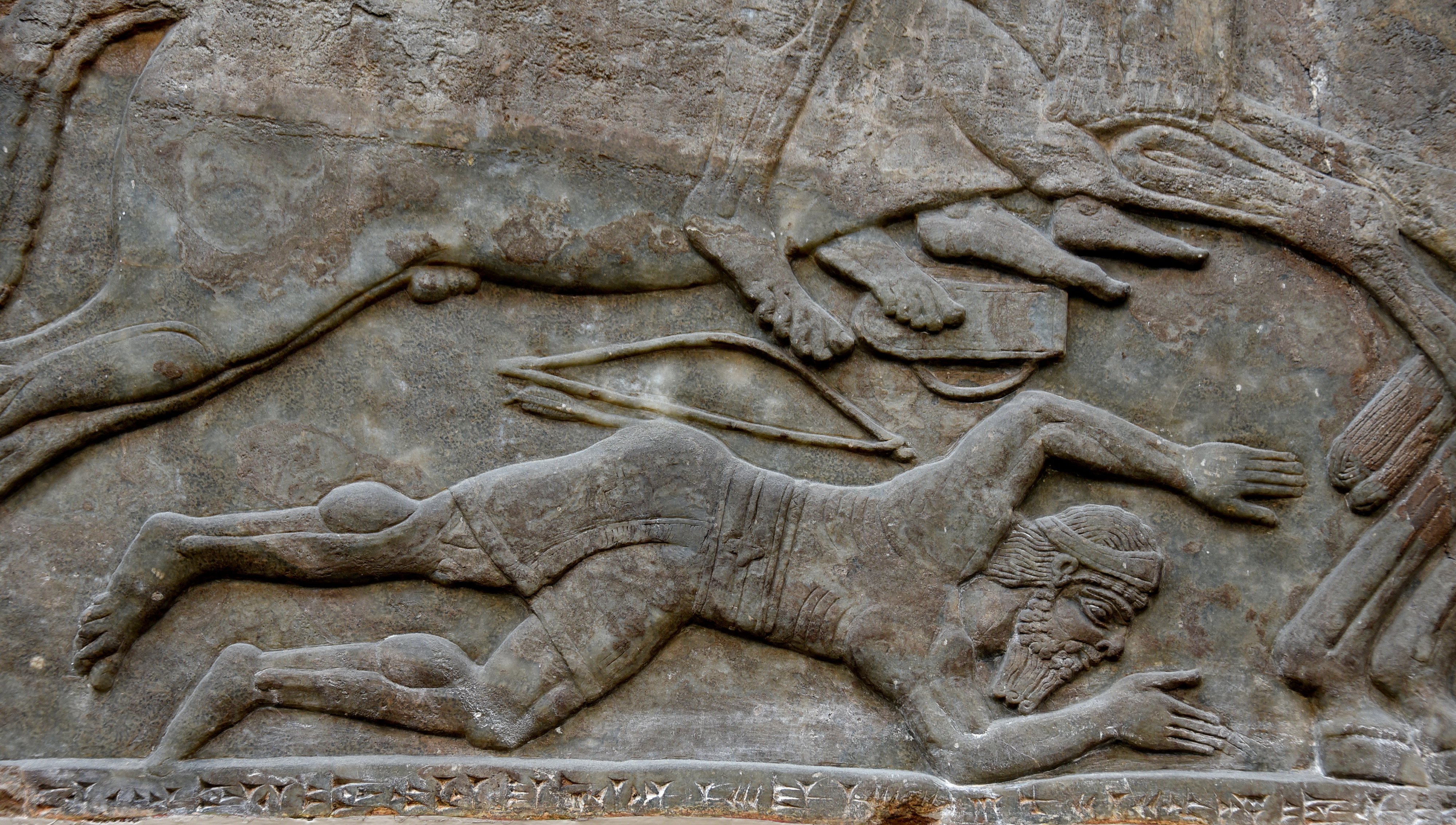 Alabaster bas-reliefs showing a fallen enemy soldier. Neo-Assyrian Period, 865-860 BCE. Detail of Panel 9 (top), Room B, the North-Palace Palace, Nimrud, modern-day Iraq. (The British Museum, London)