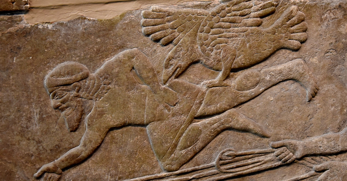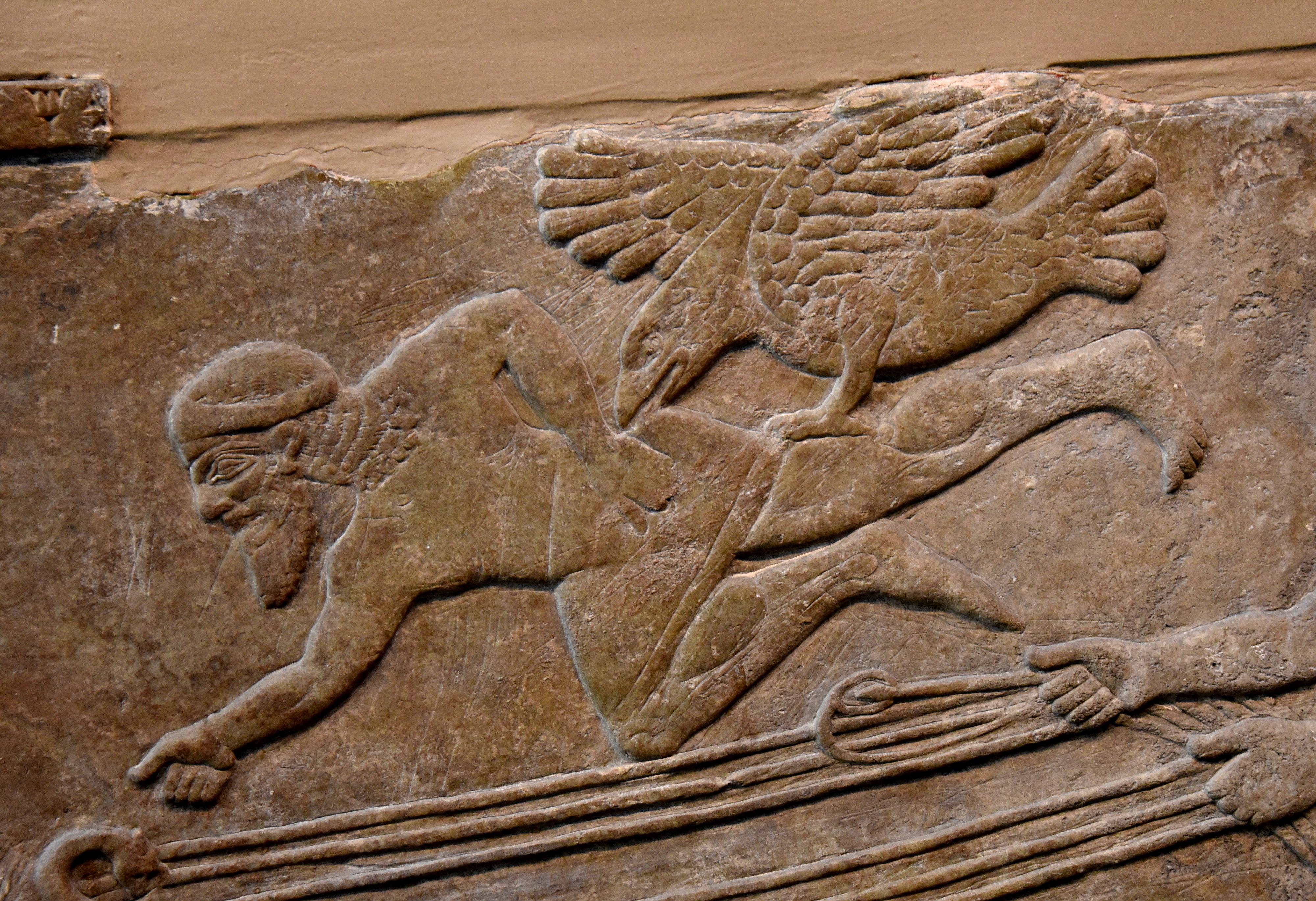 Alabaster bas-relief showing a vulture attacking a dead enemy soldier, who was killed by the Assyrian army. Neo-Assyrian Period, 865-860 BCE. Detail of Panel 3 (bottom), Room B, the North-Palace Palace, Nimrud, modern-day Iraq. (The British Museum, London)