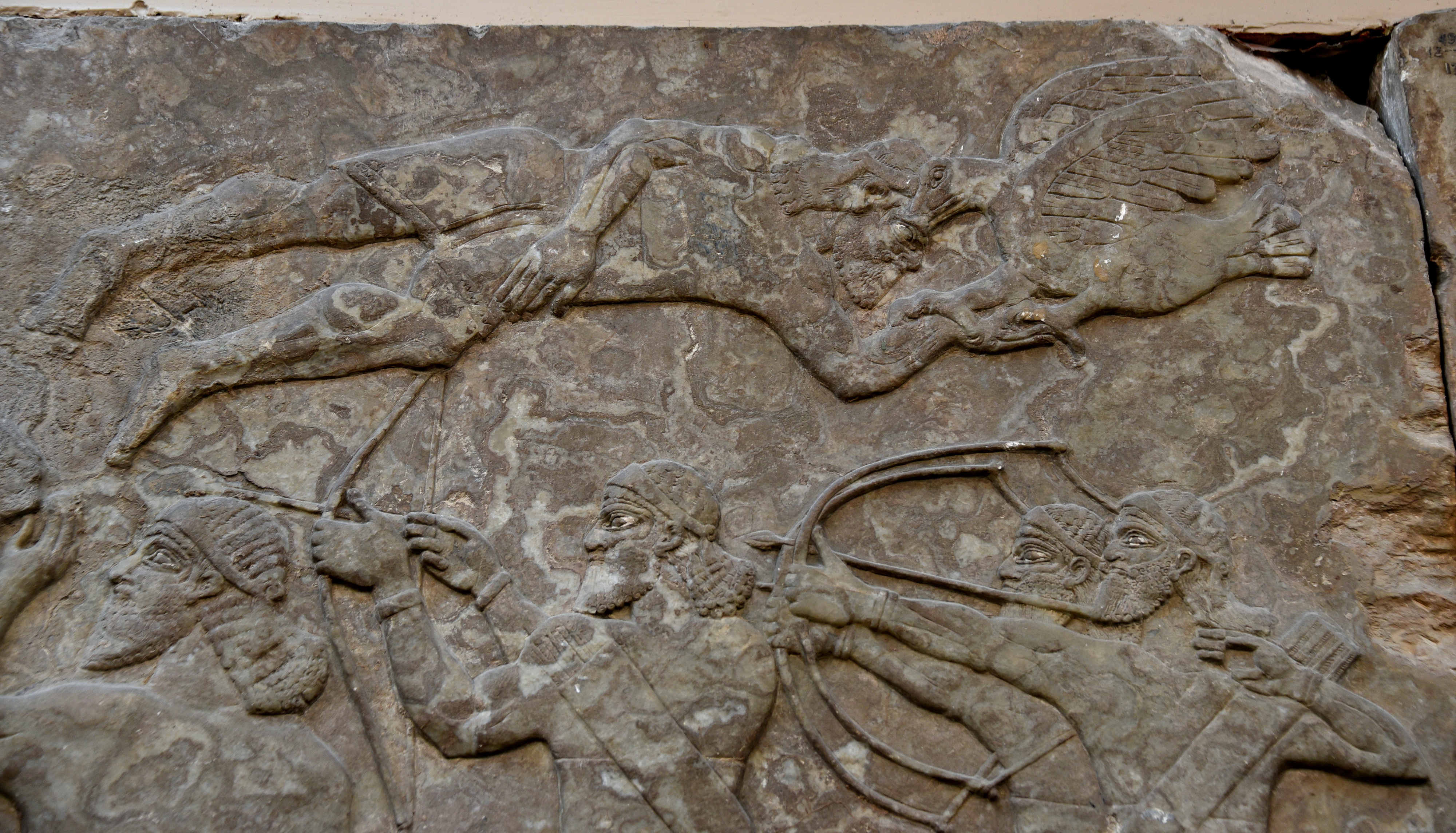 Alabaster bas-relief showing a vulture pecking an eye of a soldier who was killed by the Assyrian army. Neo-Assyrian Period, 865-860 BCE. Detail of Panel 11 (top), Room B, the North-Palace Palace, Nimrud, modern-day Iraq. (The British Museum, London)