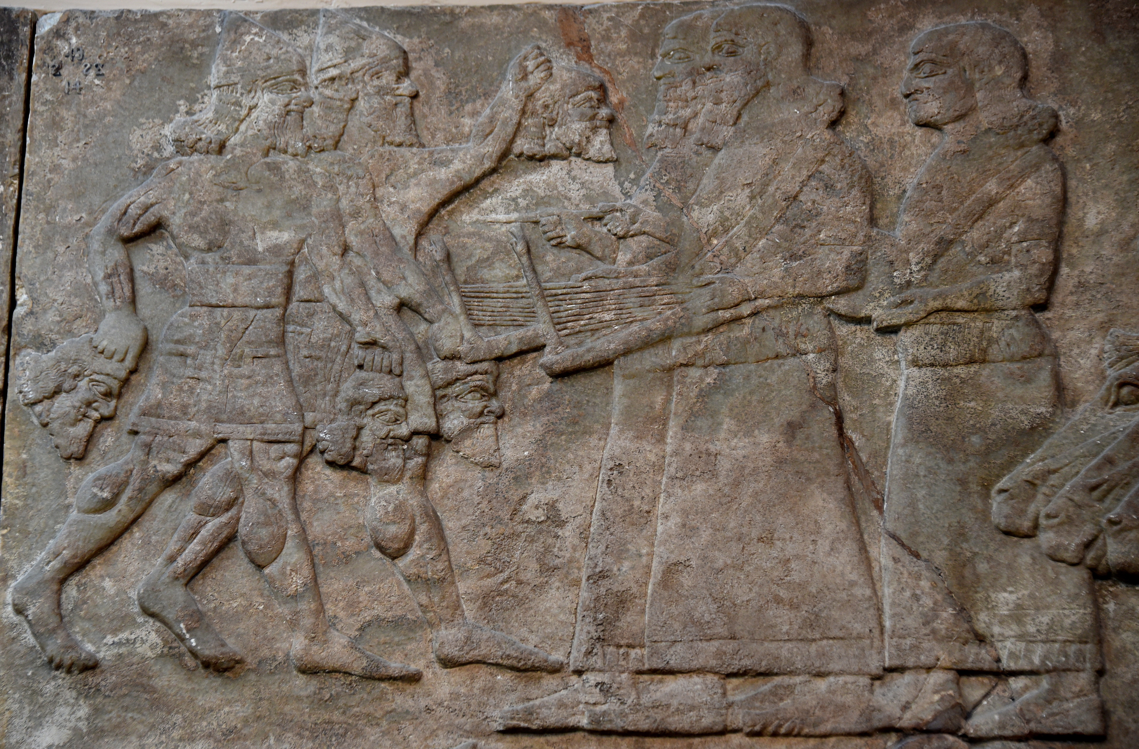 Alabaster bas-relief showing Assyrian soldiers holding the decapitated heads of their defeated enemy before Assyrian musicians. Neo-Assyrian Period, 865-860 BCE. Detail of Panel 6 (top), Room B, the North-Palace Palace, Nimrud, modern-day Iraq. (The British Museum, London)