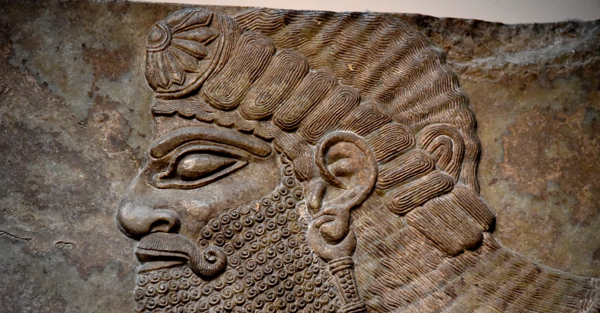 Alabaster bas-relief detail showing the head of a male Apkallu or protective spirit. Neo-Assyrian Period, 865-860 BCE. This is a detail of Panel 1, which was lining door “a” of Room T, the North-West Palace at Nimrud, modern-day Iraq. (The British Museum, London)