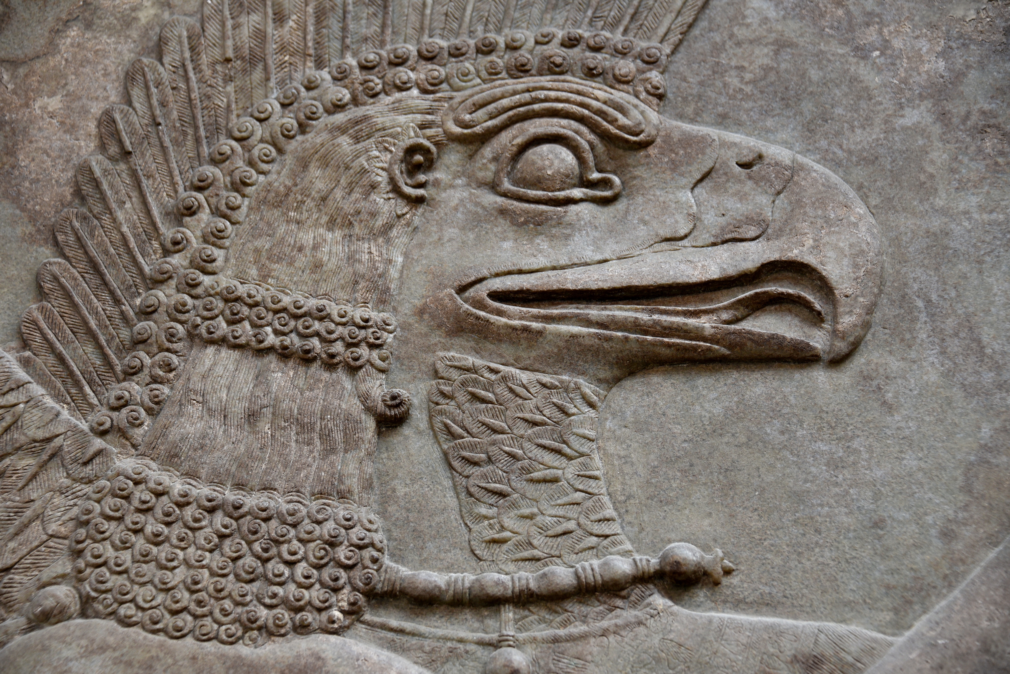 Alabaster bas-relief detail showing the head of an Apkallu or protective spirit. Neo-Assyrian Period, 865-860 BCE. Detail of Panel D1, Room G, the North-West Palace at Nimrud, modern-day Iraq. (The British Museum, London)