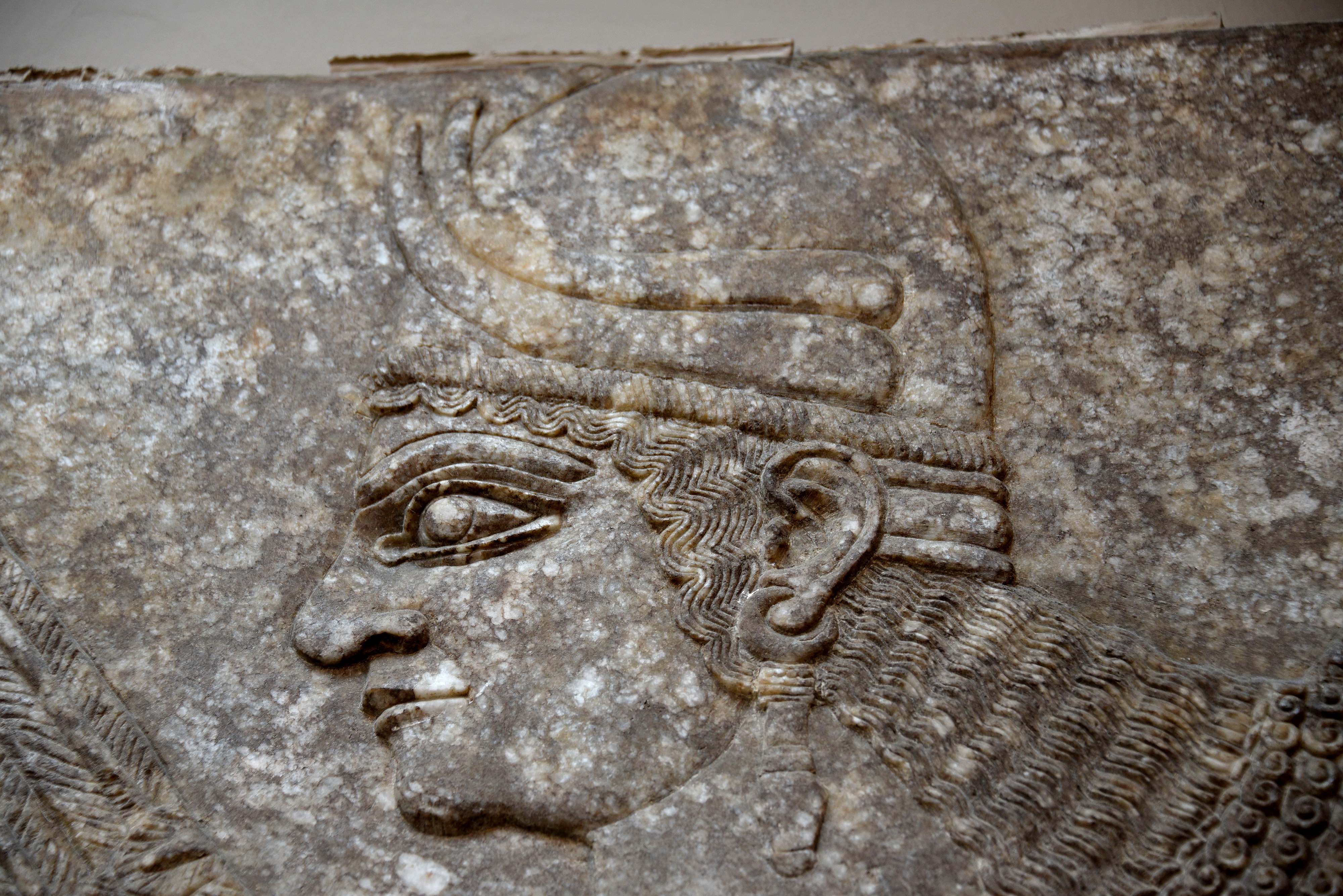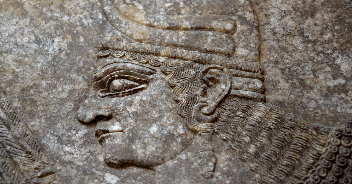 Alabaster bas-relief detail showing the head of a female Apkallu or protective spirit. Neo-Assyrian Period, 865-860 BCE. Detail of Panel 20, Room I, the North-West Palace at Nimrud, modern-day Iraq. (The British Museum, London)