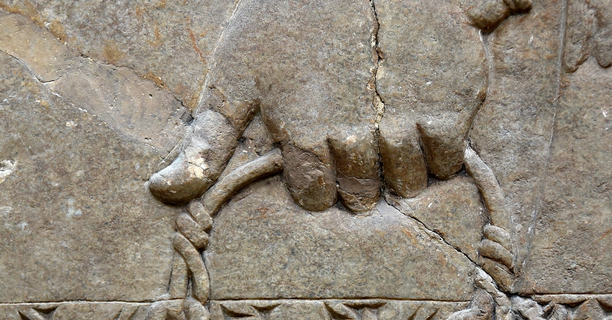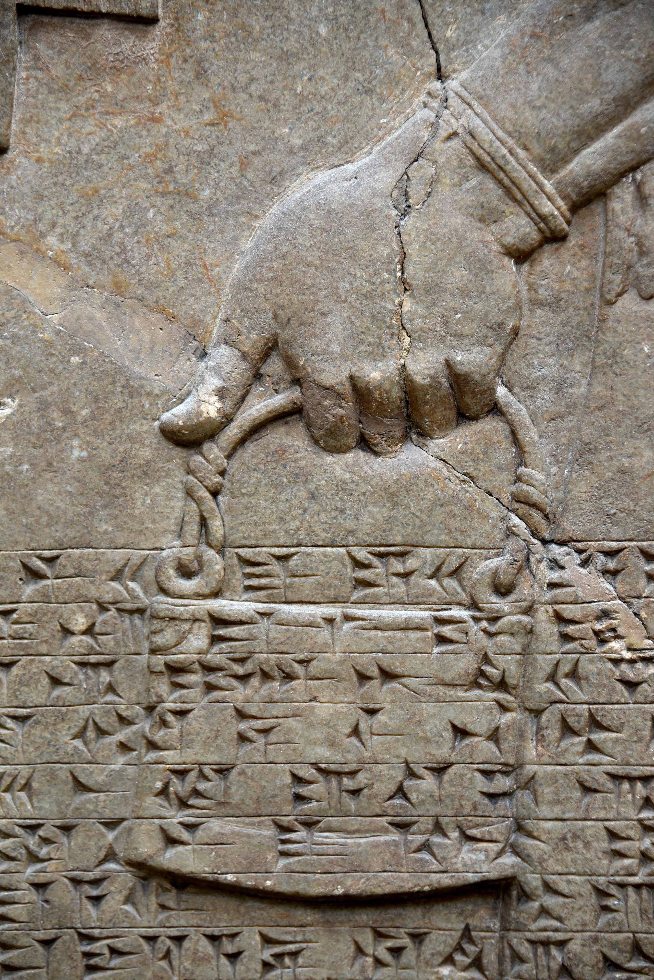 Alabaster bas-relief detail showing an Apkallu holding a bucket-like object. Neo-Assyrian Period, 865-860 BCE. Detail of Panel 23, Room B, the North-West Palace at Nimrud, modern-day Iraq. (The British Museum, London)