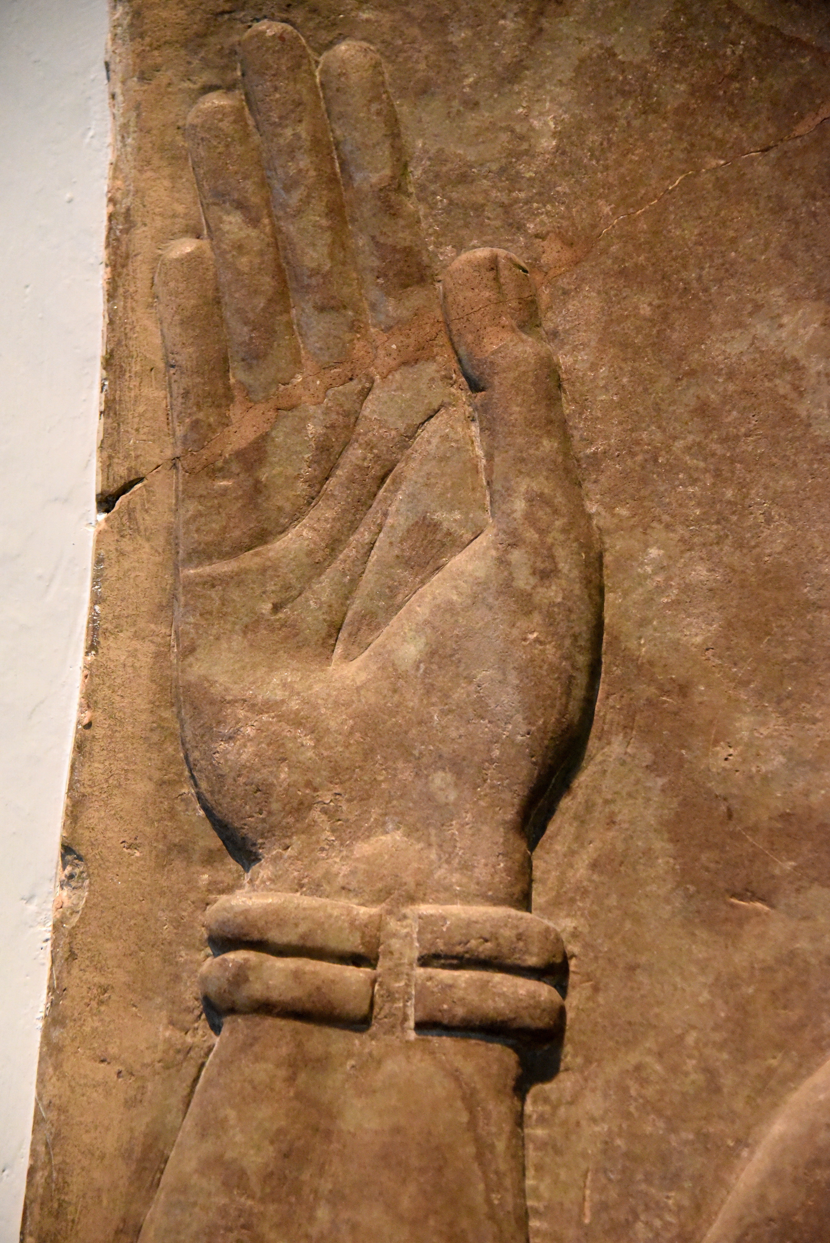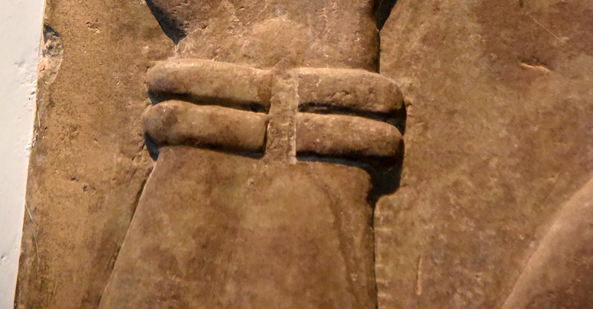 Alabaster bas-relief detail showing the hand of an Apkallu. Neo-Assyrian Period, 865-860 BCE. Detail of Panel 1, Door A, Room F, the North-West Palace at Nimrud, modern-day Iraq. (The British Museum, London)