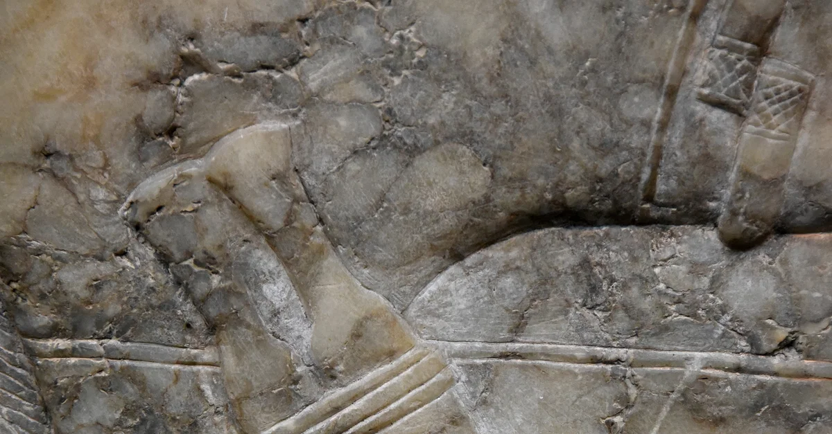 Alabaster bas-relief detail showing the daggers of an Apkallu. Neo-Assyrian Period, 865-860 BCE. Detail of Panel 16, Room I, the North-West Palace at Nimrud, modern-day Iraq. (The British Museum, London)