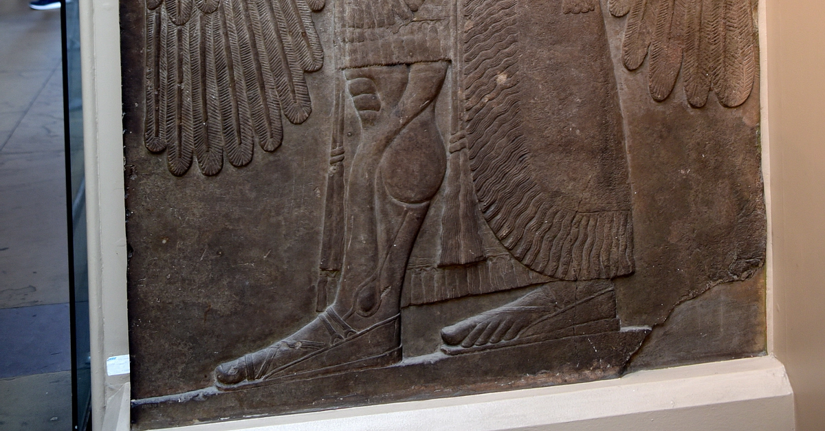 Alabaster bas-relief of an Apkallu with four wings. Neo-Assyrian Period, 865-860 BCE. Panel 26, Room B, the North-West Palace at Nimrud, modern-day Iraq. (The British Museum, London)