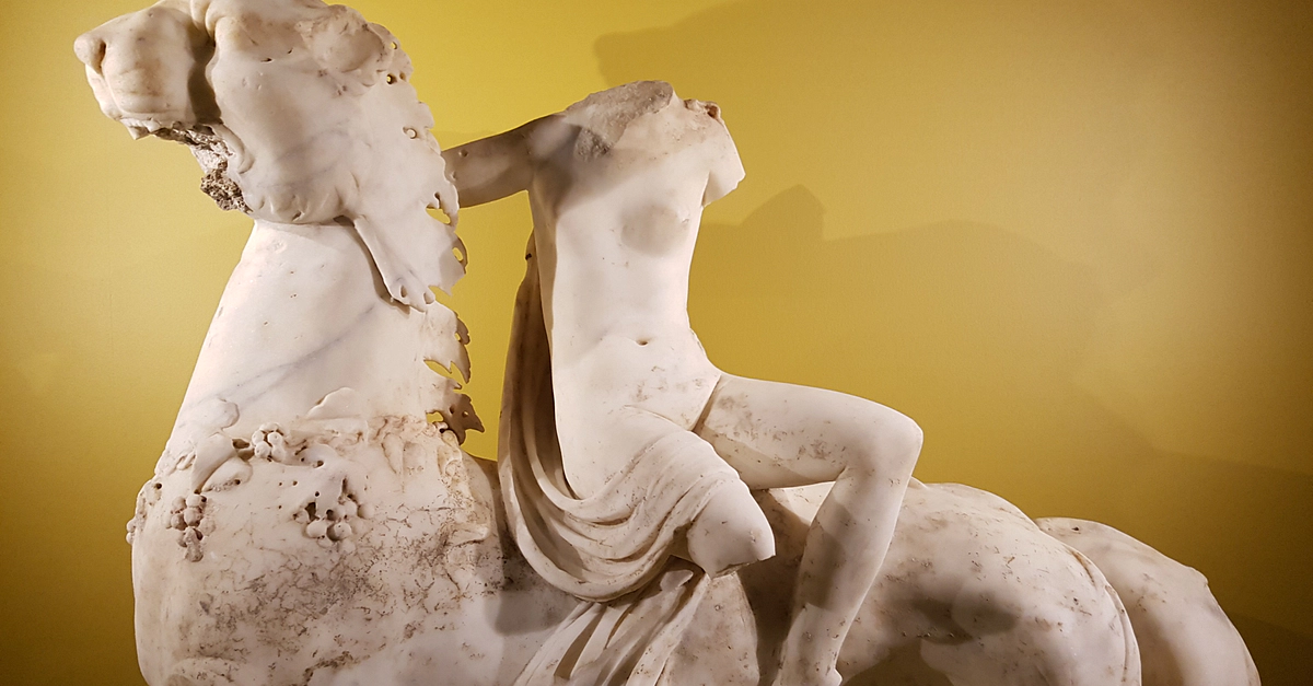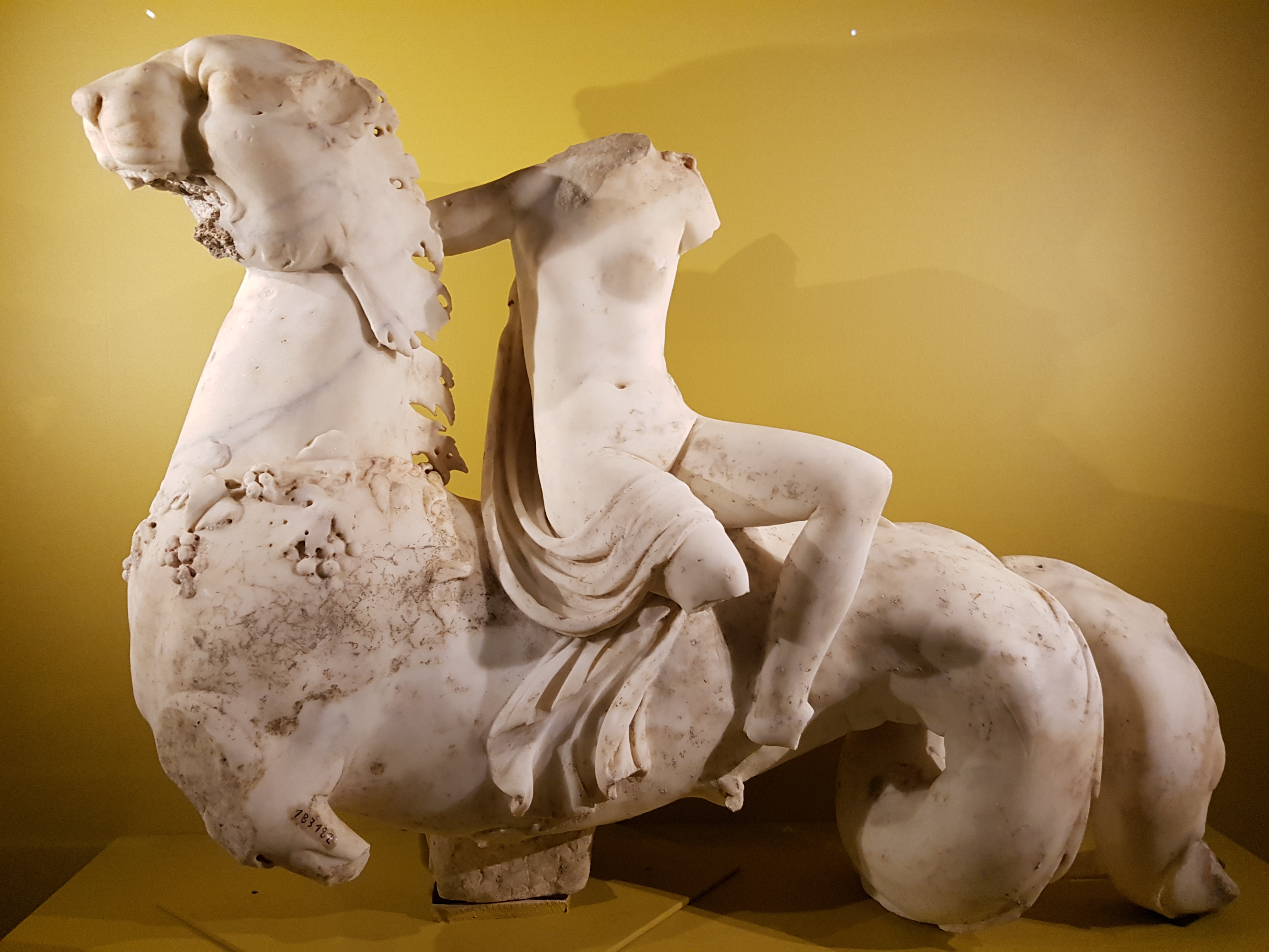 Marble fountain from Baiae. 1st century CE. A nereid (sea spirit) rides a pistrix (shark) - (the water would have originally flown from its mouth). Found in the sea off the spa resort of Baiae on the Bay of Naples, it is most likely from a villa's garden. It ended up underwater due to a bradyseism - (when the magma chamber is emptied, causing the land to fall below sea level) - from the nearby volcano at Campi Flegrei. Museo dei Campo Flegrei, (photo taken at The National Maritime Museum, Sydney)