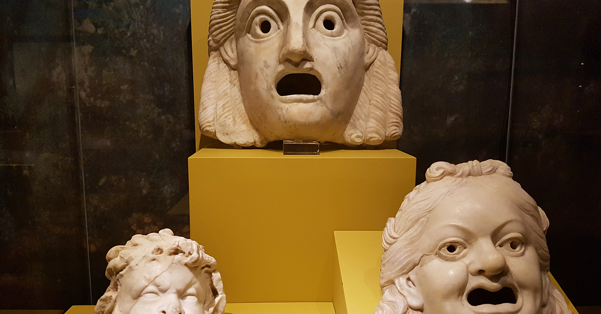 Three marble fountain heads from Pompeii. 1st century CE. In private gardens, fountains were an ostentatious display of the owner's wealth. His or her taste was shown in the choice of fountain head, such as these three: a theatre mask, a young satyr, and a woman. Museo Archeologica Nazionale di Napoli, (photo taken at the National Maritime Museum, Sydney)