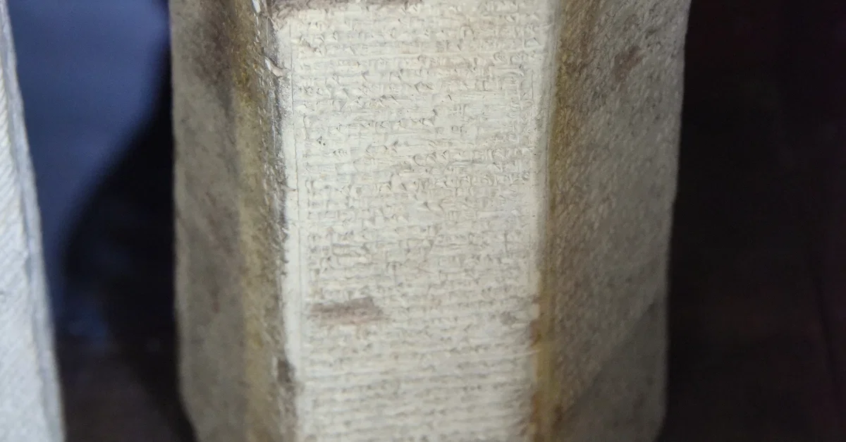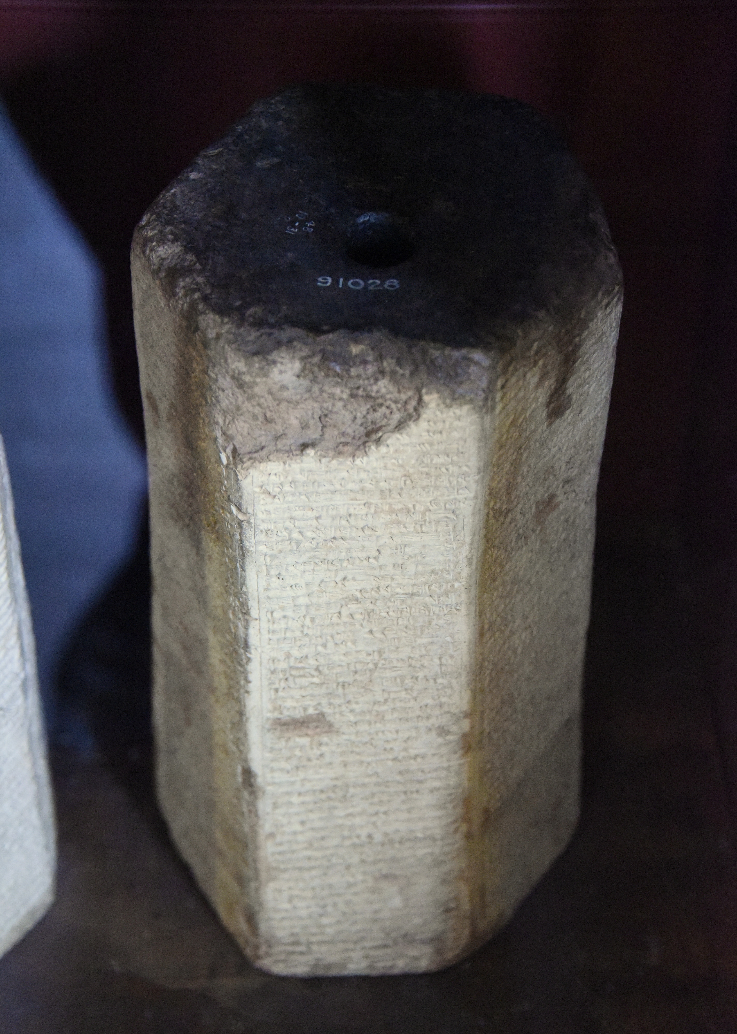 Hexagonal clay prism with cuneiform inscription narrating the military campaigns of the Assyrian king Esarhaddon (r. 680-669 BCE). Later on, the upper aspect was used a candle holder by the owner. Probably from Nineveh, Mesopotamia, modern-day Iraq. Neo-Assyrian Empire, 7th century BCE.