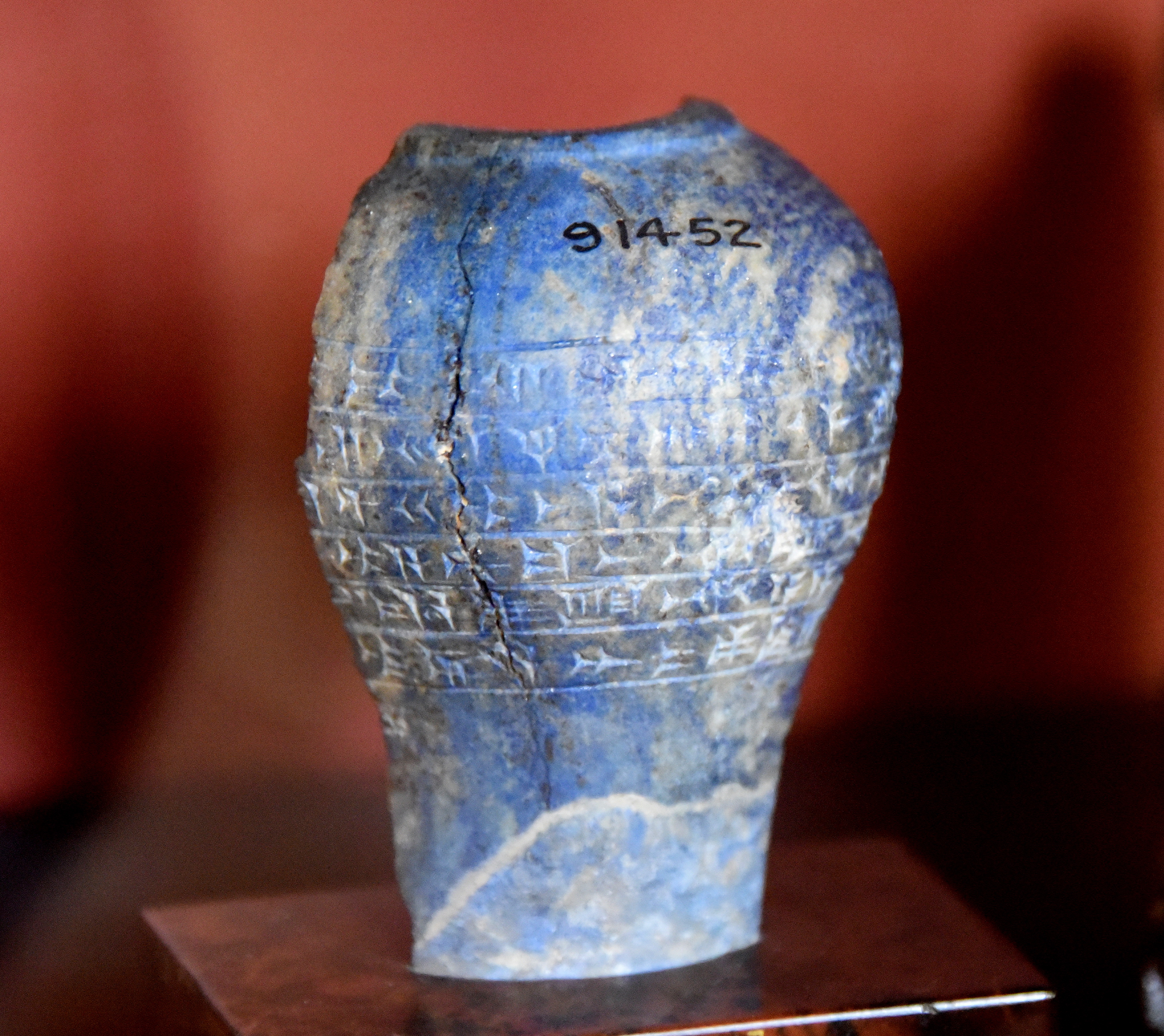 This fragment of a lapis lazuli Head-mace was inscribed with six lines of cuneiform inscriptions. The name of Ashurnasirpal II (reigned 884-859 BCE) was mentioned in this dedicatory text. Neo-Assyrian Period, 9th century BCE. From the Temple of Ninurta at Nimrud, Mesopotamia, modern-day Iraq. (The British Museum, London).