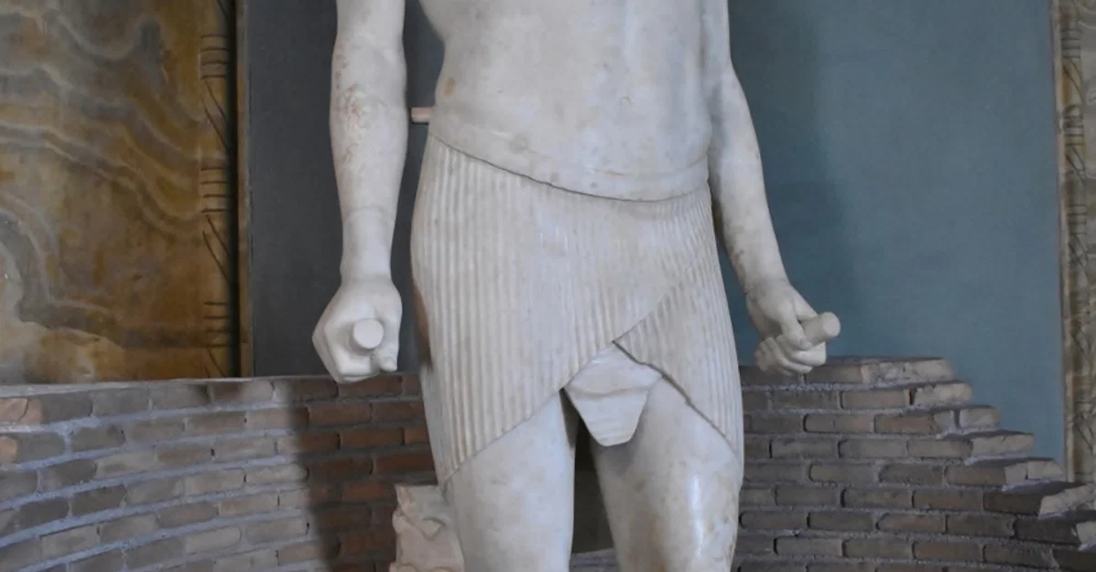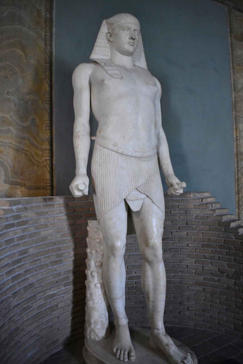 The marble statue depicts a man named Antinous and dates back to the Imperial Roman Period of Egypt late in the reign of Emperor Hadrian, about 131-138 CE. Hadrian actually founded and named a city, Antinopolis, after Antinous' death in 130 CE. Antinous was soon being worshipped as a deity. His cult figure was known as Osiris-Antinous. (Gregorian Egyptian Museum, Vatican Museums, Rome)