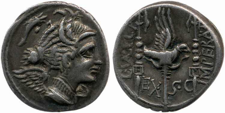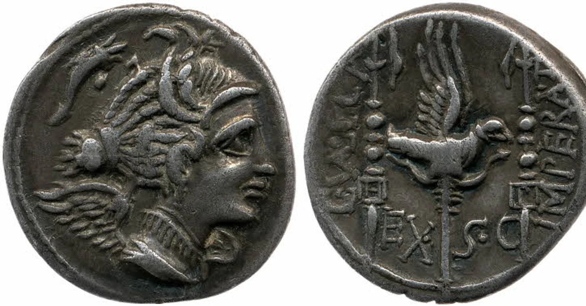 Silver denarius depicting Victory on one side and a Roman legionary standard topped with an eagle on the other. Minted in Massalia, 82 BCE.