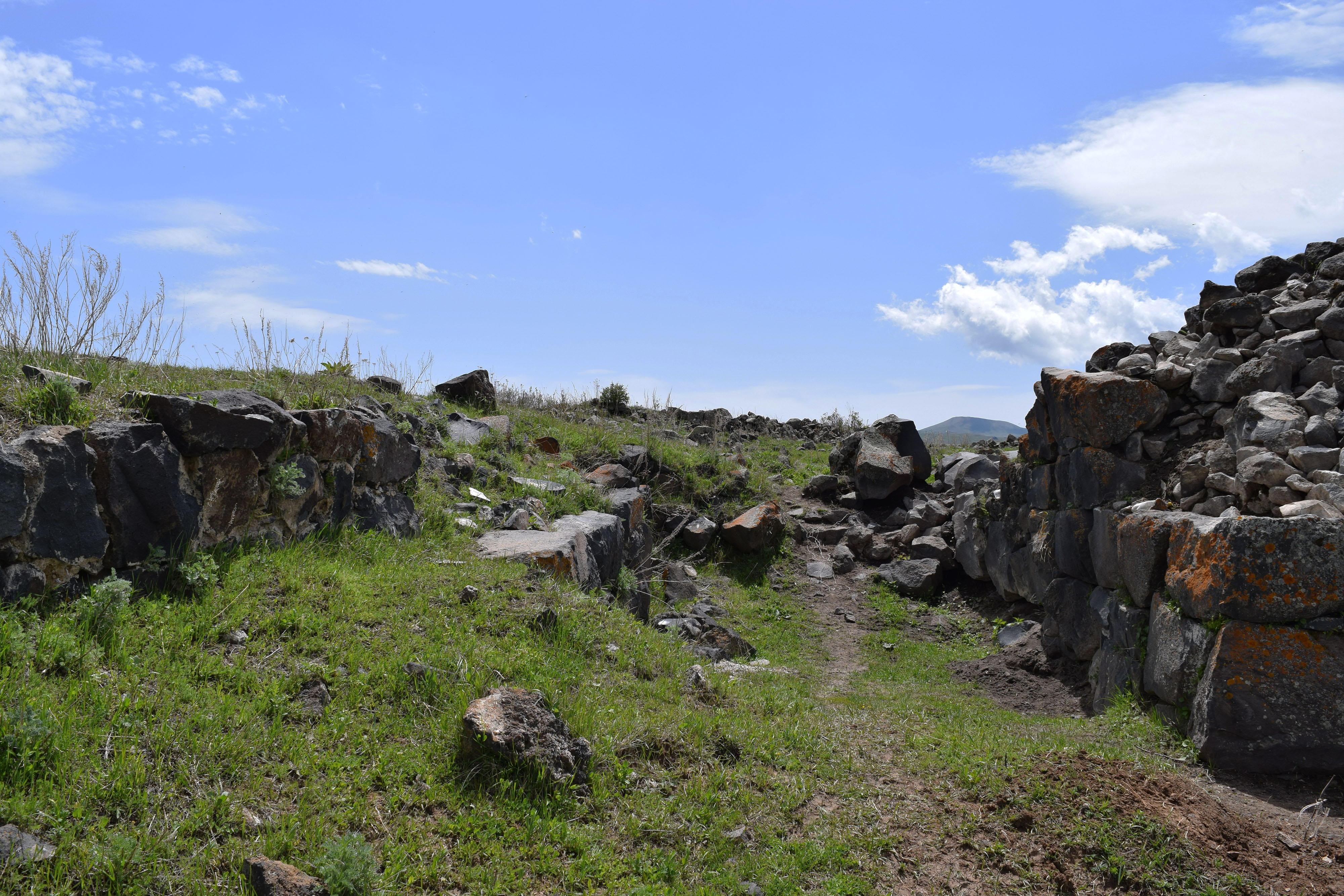 Located along the northern steep slope of the Geghama Mountains, Lchashen, in present-day Armenia, is home to several ancient ruins and archaeological sites of considerable interest. Archaeologists and researchers posit that Lchashen was first founded at the end of the 4th millennium BCE, and the hill fortress developed in the middle-to-end of the 3rd millennium BCE. This is a photograph of the ruins of the hill fortress.