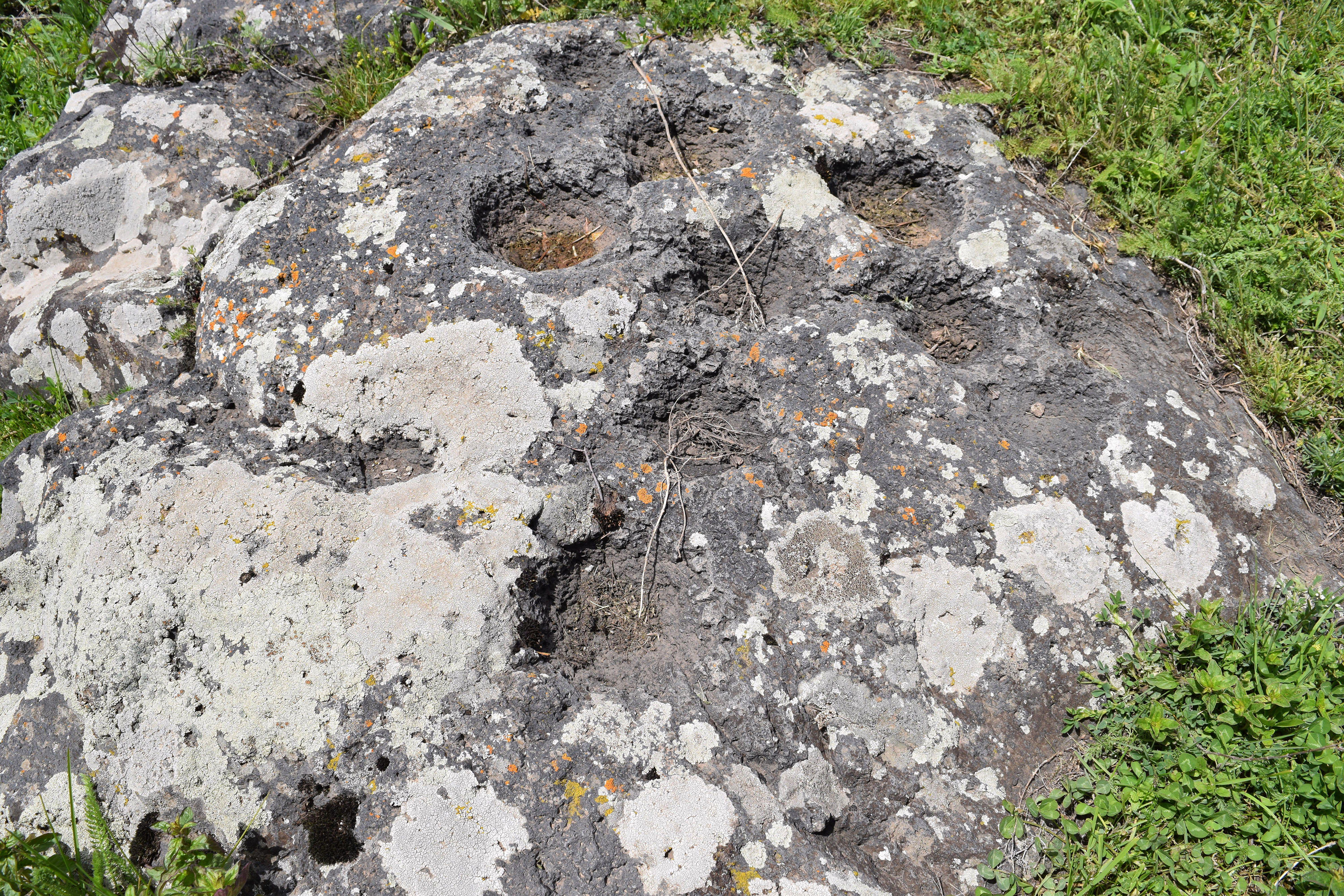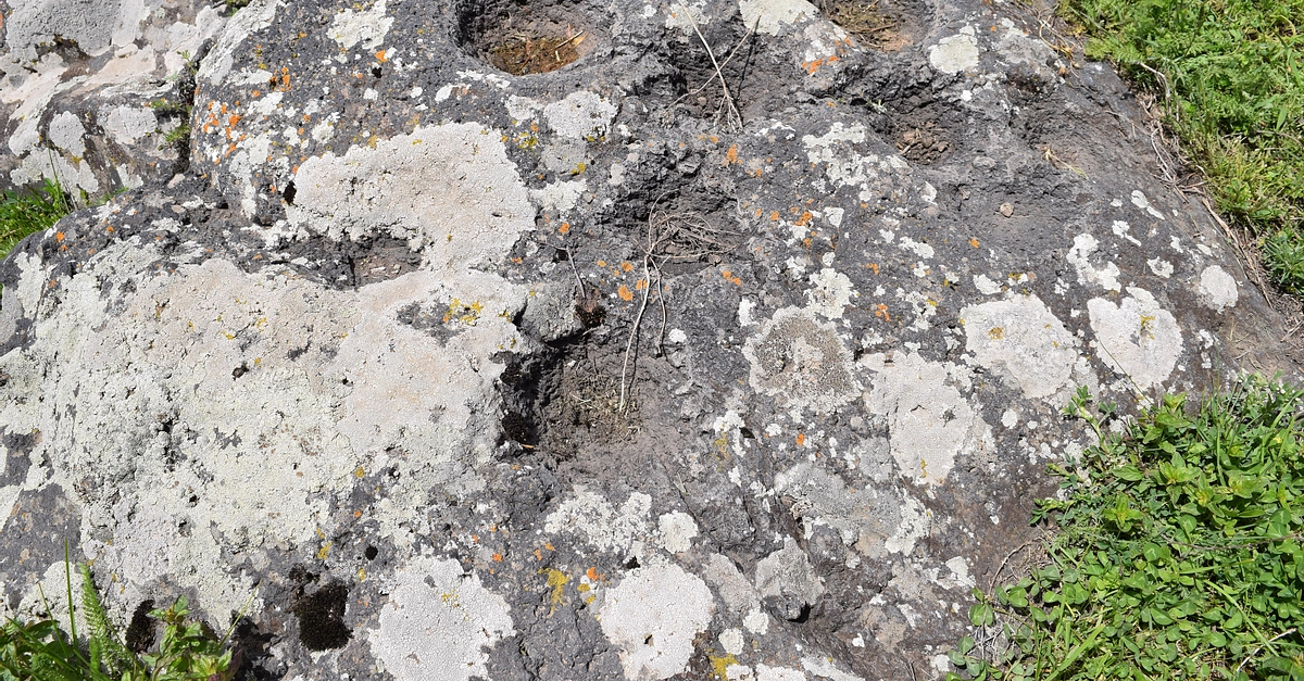 Around the cyclopic fortress of Lchashen, there are also the remains of an ancient settlement, which date back to the 4th millennium BCE. Excavations have revealed that the settlement had straight streets lined by round and rectangular structures. In this picture, we see indentations carved into stone, which were used for storing liquid matter or goods.