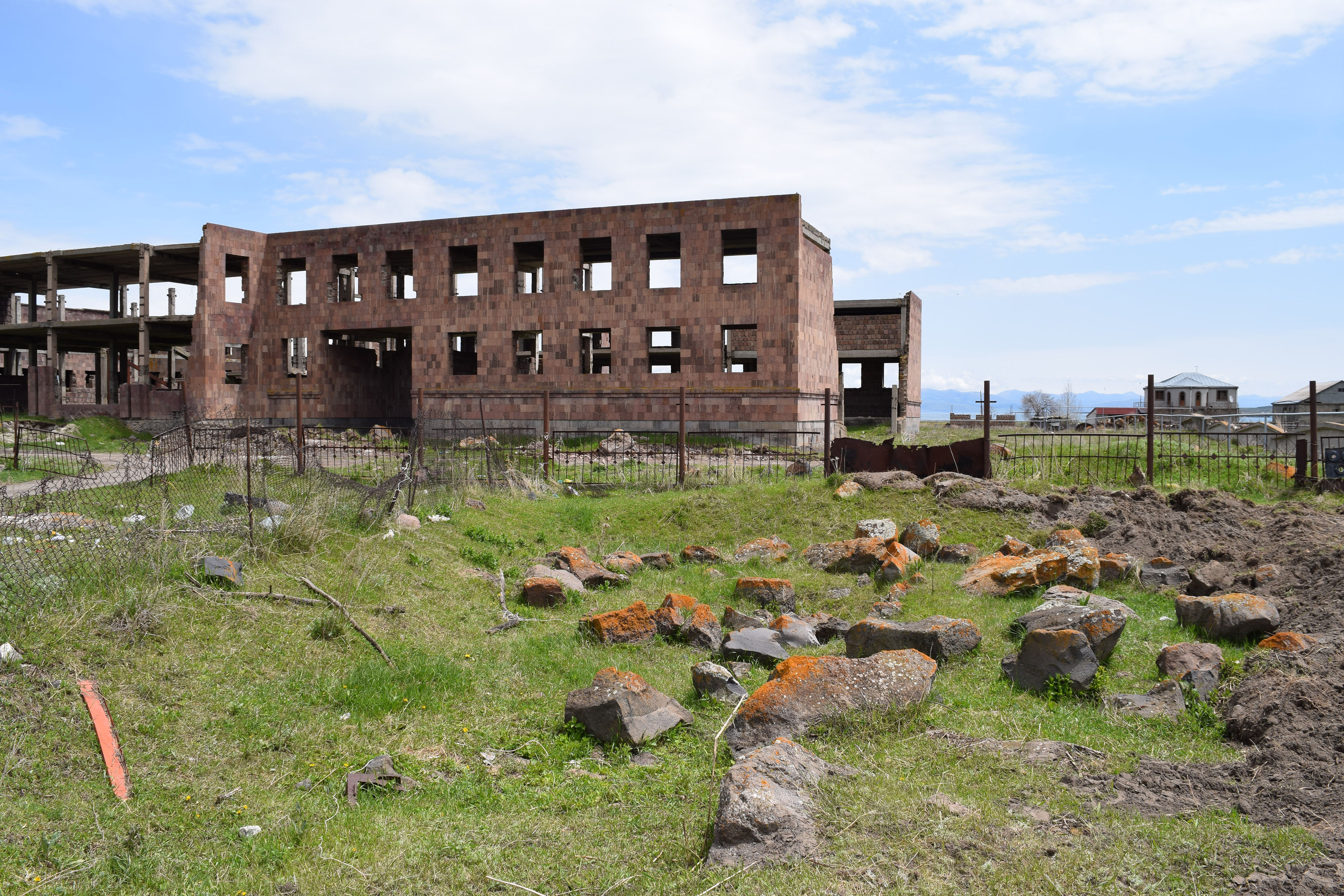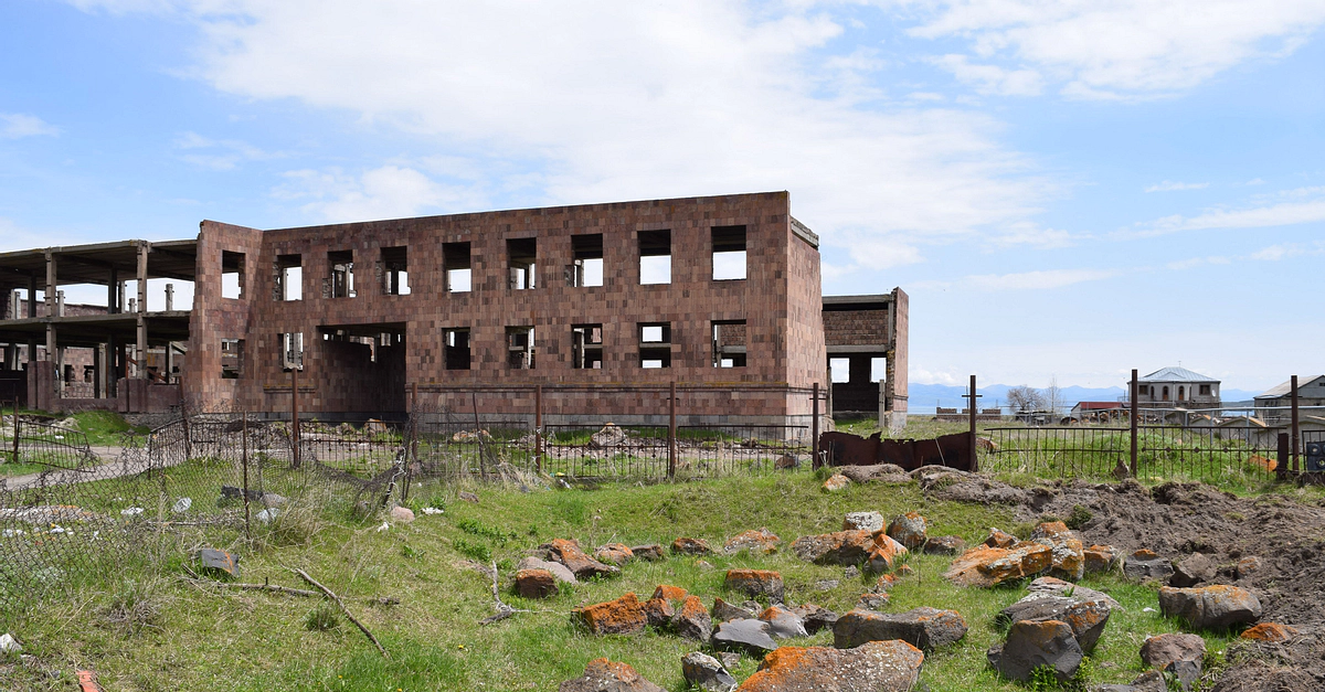 Lchashen is a rich archaeological site in Armenia with Bronze Age burial crypts, cuneiform inscriptions, an Iron Age fortress, and a medieval church. Over 800 ancient burial sites have been discovered in the area since the 1950s. In this picture, one can see ancient burial blocks made of stone that were sadly compromised during the Soviet era. (Note the abandoned and derelict Soviet factory in the background.)