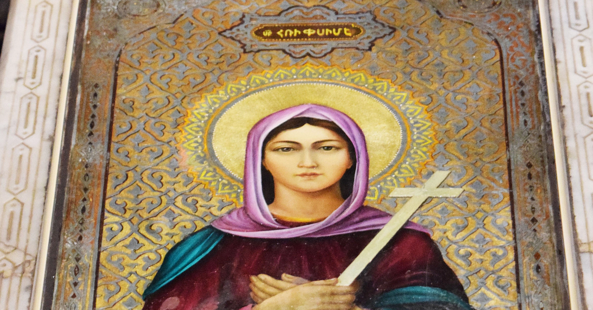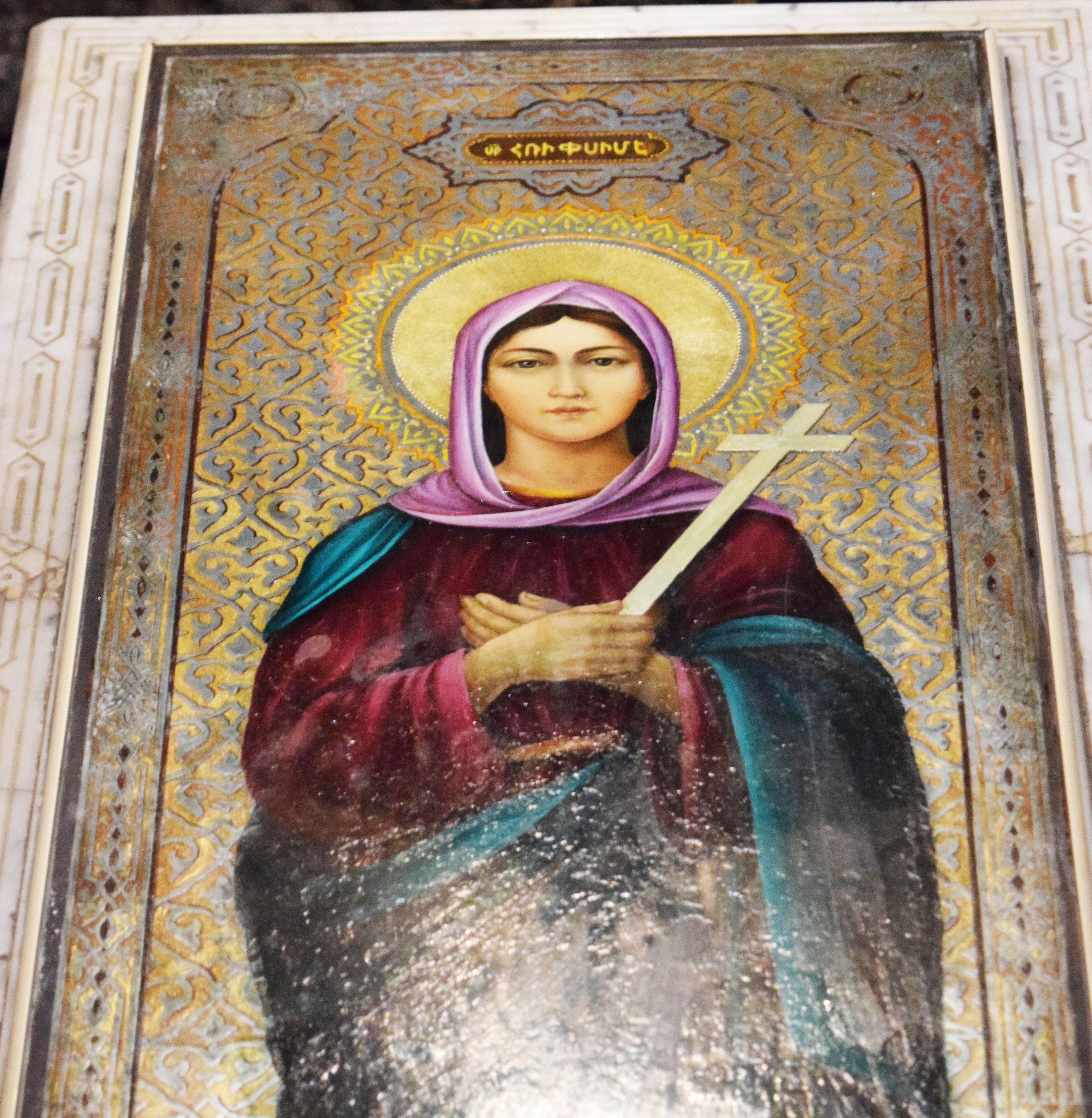 This is the tomb of Saint Hripsime at the Saint Hripsime Church in Etchmiadzin (Vagharshapat), Armenia. According to Armenian traditions, Saint Hripsime (d. c. 290 CE) was one of the first Christian martyrs in Armenia. She was of Roman origin and possibly an aristocrat who had taken an early interest in Christianity. She traveled throughout the Roman Empire with 35 other nuns before finally arriving in Armenia. There, she attracted the interest of King Tiridates III (r. 287-330 CE) due to her beauty. However, because she rejected the advances of the king, she was tortured to death. Hripsime is venerated by the Armenian Apostolic Church, the Georgian Orthodox Church, the Coptic Orthodox Church, and the Roman Catholic Church. She is also venerated by the Ethiopian Orthodox Tewahedo Church.