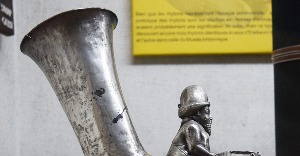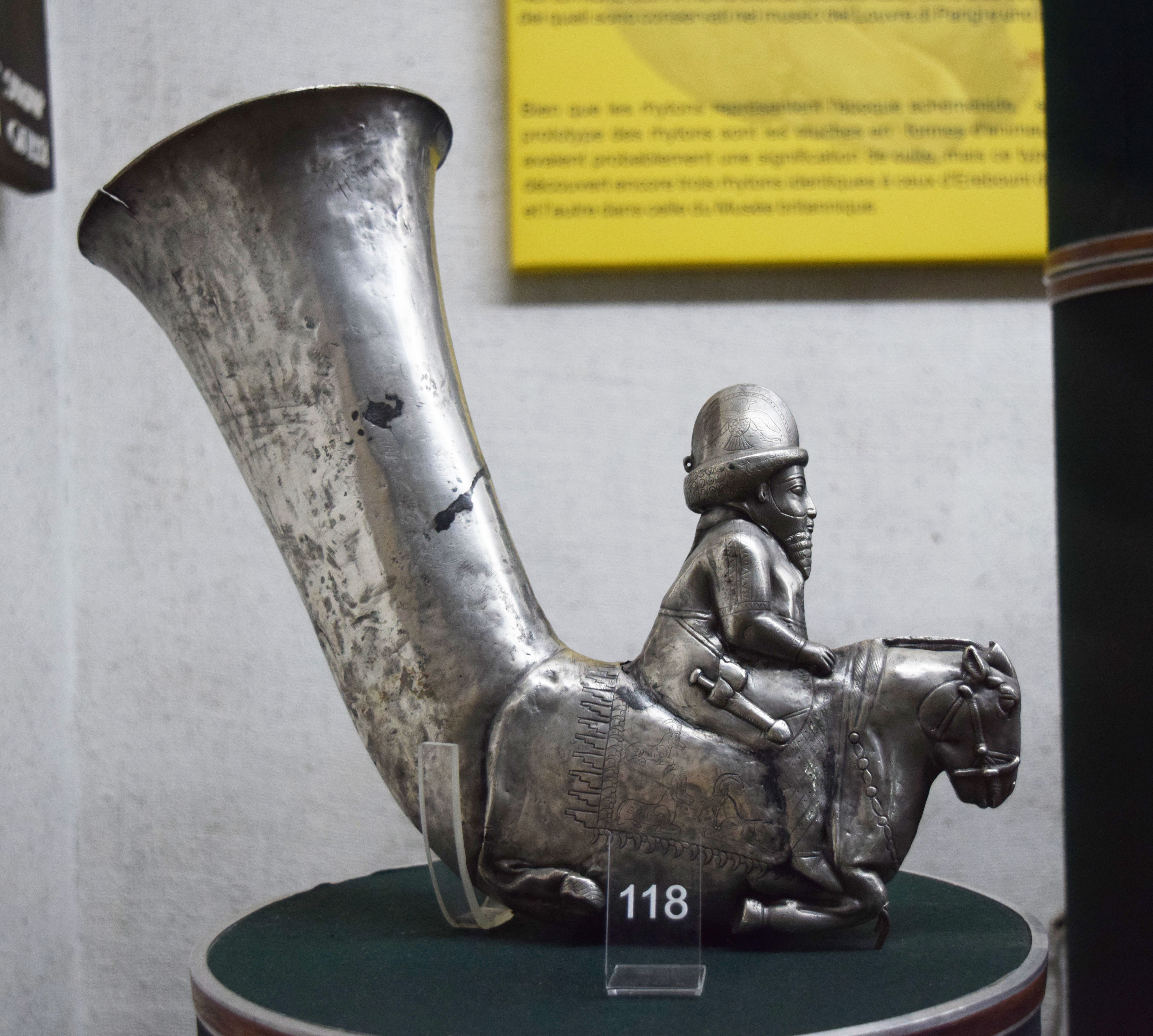 This horse rider ryhton was discovered while archaeologists excavated the ancient Erebuni Fortress, which is located in present-day Yerevan, Armenia. It dates from the 5th century BCE when Erebuni was under Persian control and was cast in silver. (Erebuni Historical and Archaeological Preserve, Yerevan, Armenia.)