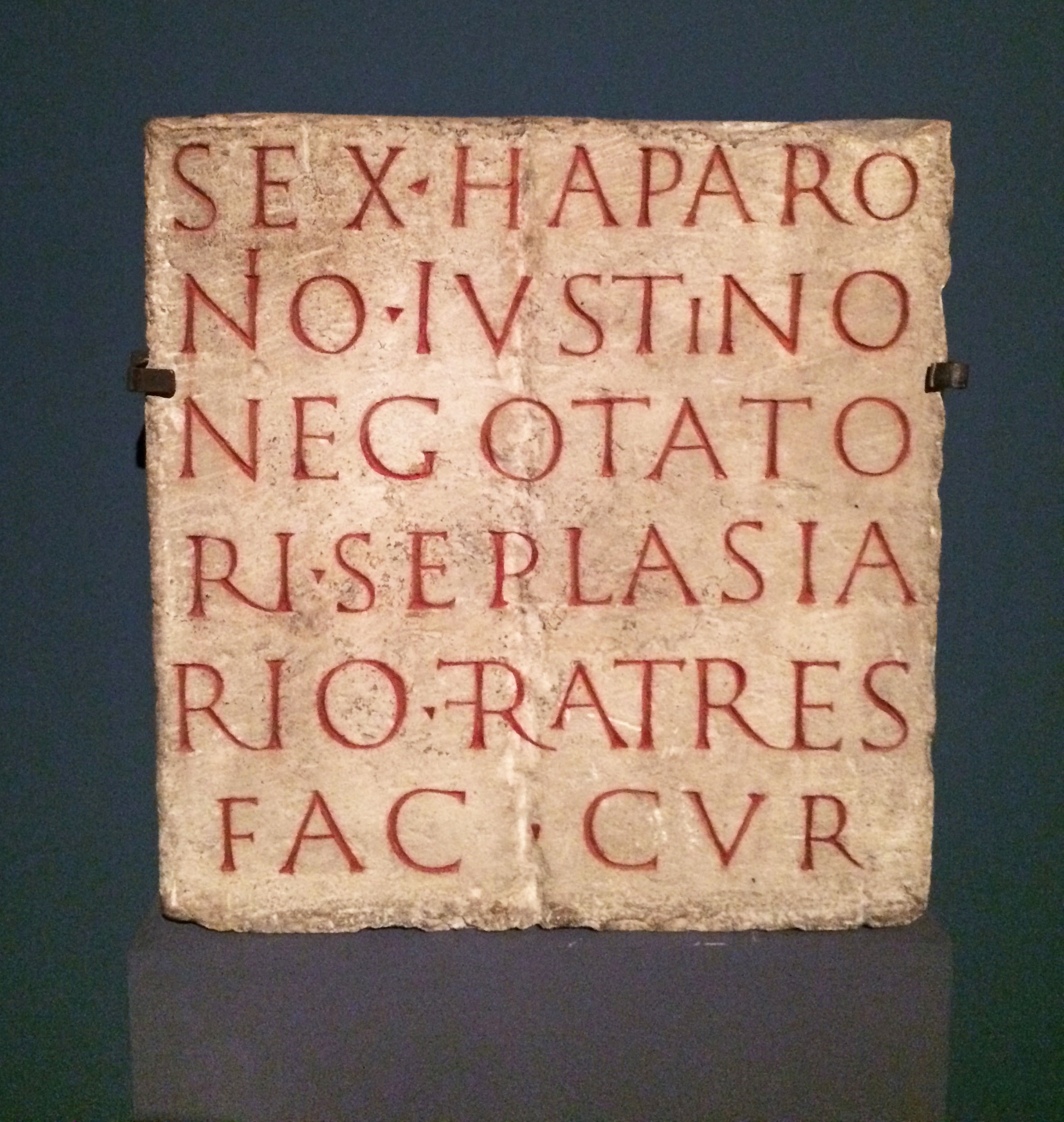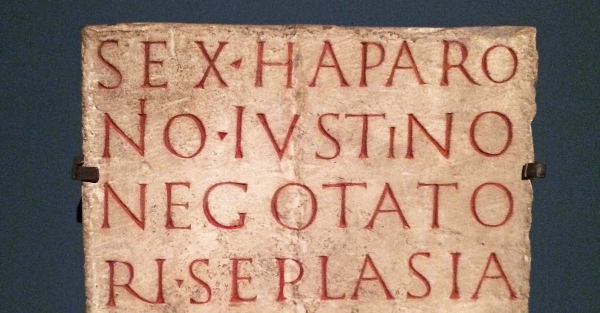 Sextus Haparonius Iustinus was a "seplasarius" — a trader in perfumes and unguents — who lived in what's present-day Cologne, Germany during the 2nd century CE. When he died, his "brothers" erected a funeral monument of stone in his honor. The inscription, originally set in its masonry, was found in St. Cunibert's Monastery in Cologne. The professional title "seplasarius" comes from the name of a street in Capua, in Campania, Italy. The perfumes created in the workshops there were of such high quality that the street name became a generic term. (Römisch-Germanisches Museum, Cologne)