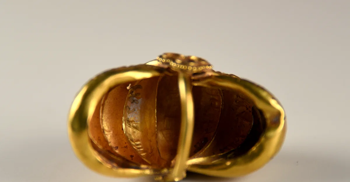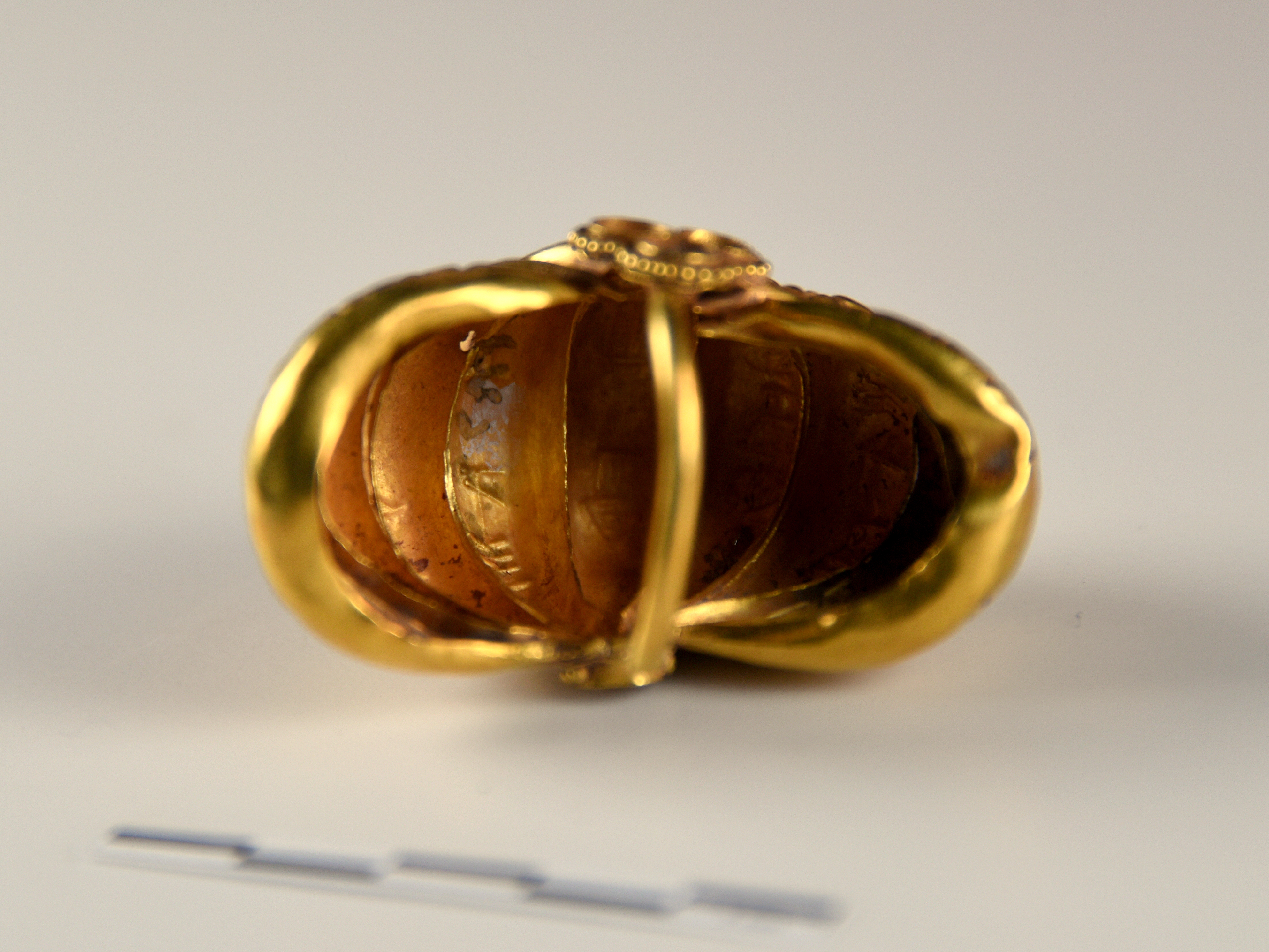 The interior hollow surface of the earring. Note how the carved cuneiform signs appear on this side and how the goldsmith joined the “lunar-shaped” segments of the earring. The cuneiform text is read vertically, from the upper surface downwards on each segment, and it continues from right to left. One of a pair of gold earrings, 24 carats. Gift from Shulgi to a chief of servants of a temple. The name of the goddess Mammetum appears. Exclusive photo. Ur III Period, reign of Shulgi, 2093-2046 BCE. Probably from Southern Mesopotamia, modern-day Iraq. (The Sulaymaniyah Museum, Iraq).