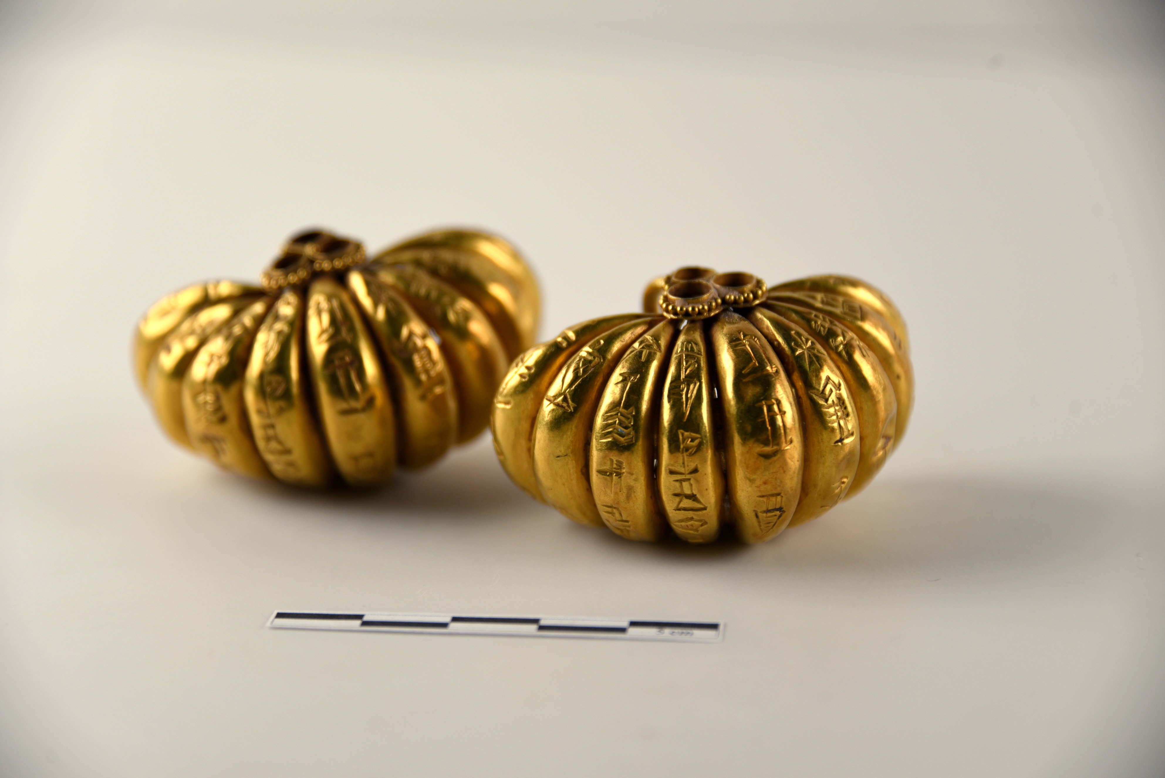 The convex and carved surfaces of the earrings. Each earring is composed of nine lunar-shaped segments forming a flattened half- ball. The cuneiform signs run vertically from above downward, starting from the right end. A pair of gold earrings, 24 carats, approximately 48 grams. Gift from Shulgi to a chief of servants of a temple. The name of the goddess Mammetum appears. Exclusive photo. Ur III Period, reign of Shulgi, 2093-2046 BCE. Probably from Southern Mesopotamia, modern-day Iraq. (The Sulaymaniyah Museum, Iraq).