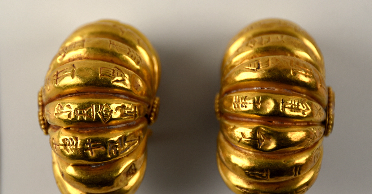 Both earrings are placed in a mirror-image position, with the lower surfaces facing each other. Each earring is composed of nine lunar-shaped segments forming a flattened half- ball. The cuneiform signs run vertically from above downward, starting from the right end. A pair of gold earrings, 24 carats, approximately 48 grams. Gift from Shulgi to a chief of servants of a temple. The name of the goddess Mammetum appears. Exclusive photo. Ur III Period, reign of Shulgi, 2093-2046 BCE. Probably from Southern Mesopotamia, modern-day Iraq. (The Sulaymaniyah Museum, Iraq).