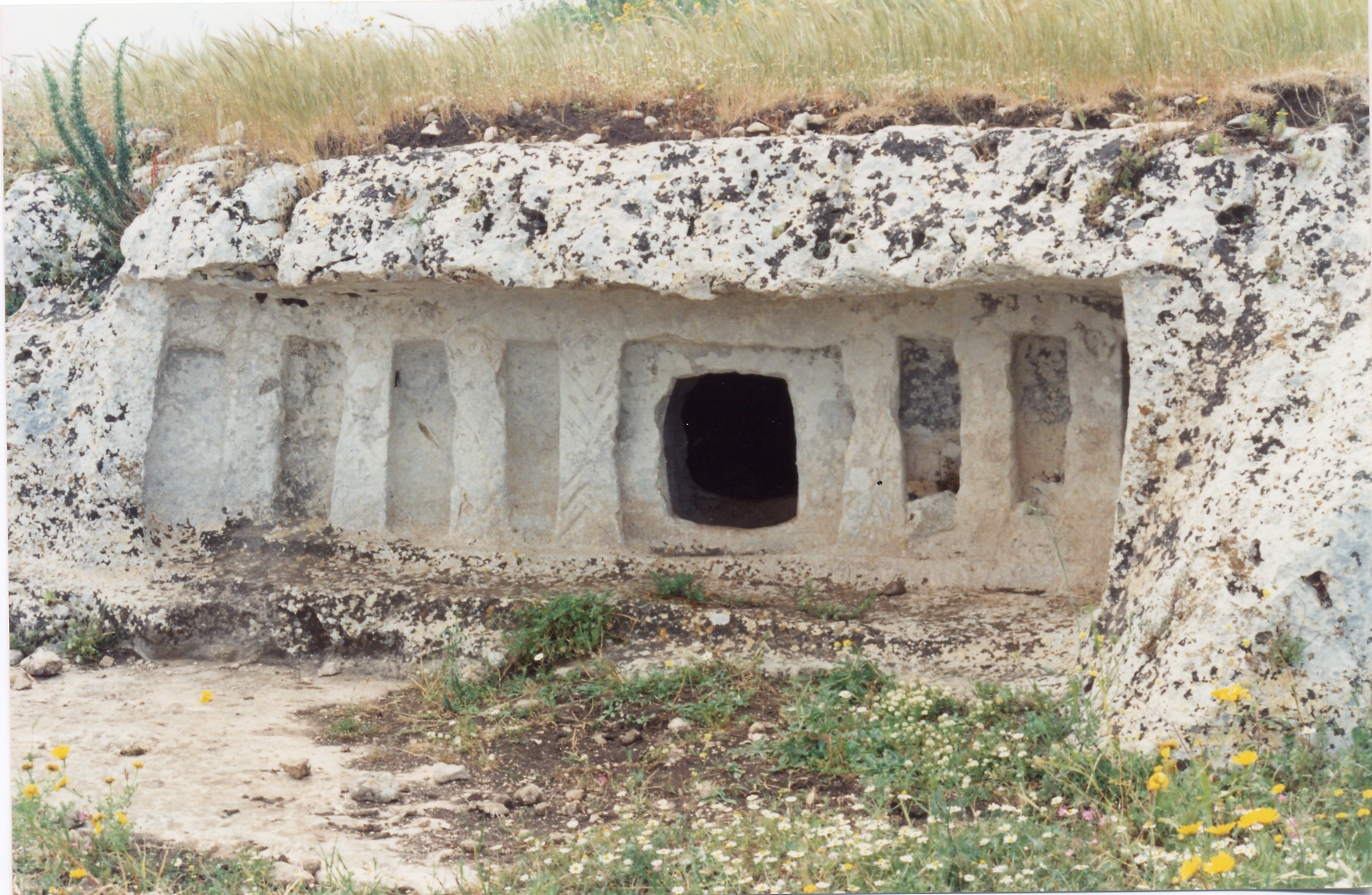 Castelluccian Culture tomb (early bronze age, 2200-1400 BCE) excavated in the rock, with a double-room and eight false pillars on the facade, in bas-relief, finely decorated with chevron engraving, triangles, circles and dots right inside. Some scholars think these signs relate to a solar cult, especially for the pointillist circles on the top of the columns; others have interpreted the linear series as an extreme stylization of the deceased. In the same area, discovered at the end of the 19th century CE, was one of the mysterious "globule bones" (pieces of long bones of animals, whose length scarcely exceeds ten centimetres, on which have been realized some globules in relief) which have also been found in Troy.