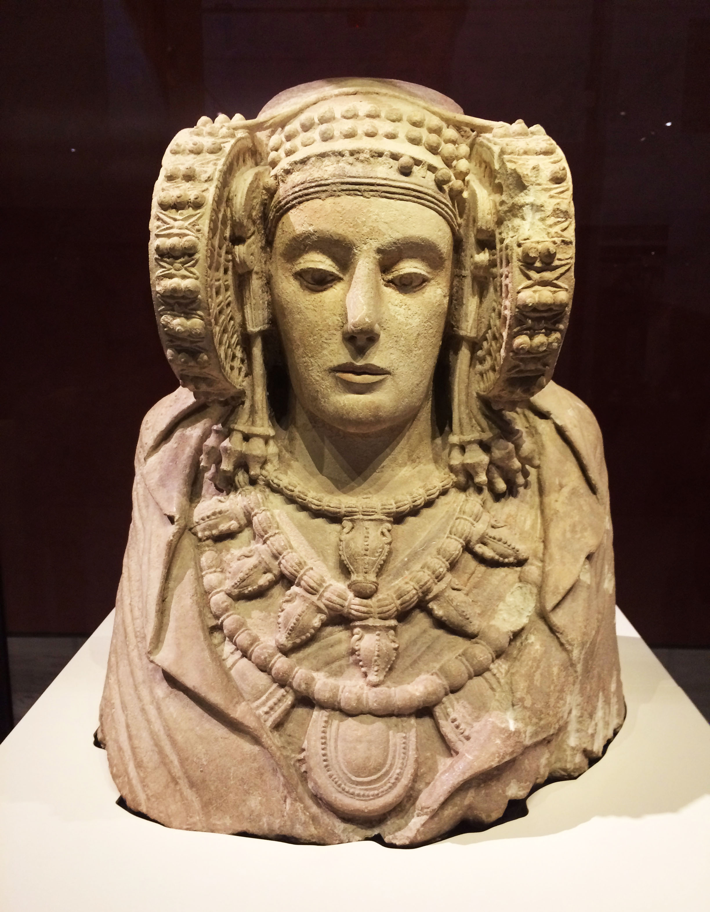 The "Lady of Elche" or "Lady of Elx" is a masterpiece of ancient Iberian culture. Carved in the round, the sculpture represents a woman with an idealized face, richly garbed and bejeweled. Made of limestone in the late 5th-early 4th century BCE, the "Lady of Elche" was originally polychromed and the eyes were filled with vitreous paste. Numerous theories of authorship exist, but today most believe that an Iberian commissioned it from a sculptor who was Greek or trained in Greek workshops. The "Lady of Elche" was discovered by chance at the archaeological site of La Alcudia, near the town of Elche, Spain and soon after was sold to the Musée du Louvre in Paris. It was displayed there until 1941, when the French and Spanish governments negotiated its return to Spain. The singular nature of this sculpture has made it an icon of Iberian archaeology. Numerous hypotehses have been posited about the aperture at the back and its possible fuction: as a slot to accomodate a bracket for atttaching the bust to the wall; as a reliquary; and— the most widely accepted—as a possible funerary urn. There are three hypotheses regarding its form: a busy, with similarities to other Iberian sculptures (Baza, Elche); a full-length sculpture, like the "Great Lady Offerant of Cerro de los Santos"; and a seated figure, a time-honored tradition in Iberian statuary. The lady's identity is a mystery but she is attributed both a human and divine nature. Nowadays, the sculpture is interpreted as the portrait of an Iberian aristrocratic woman who was deified by her descendants. (Museo Arqueológico Nacional, Madrid)