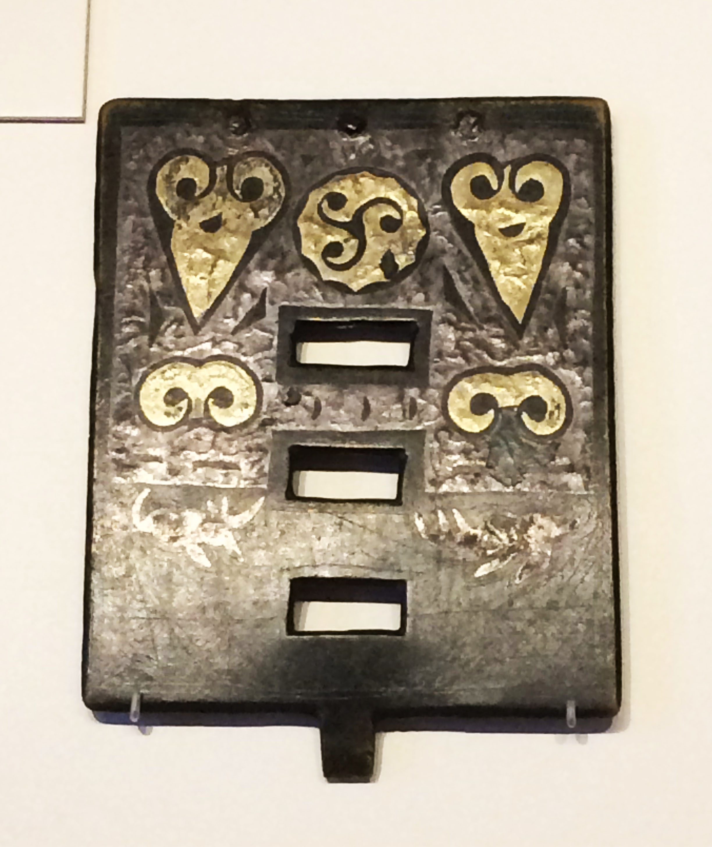This belt buckle depicts wild boars and is made from bronze, silver, and gilded silver. It was made by members of the Carpetani culture around the 3rd-2nd century BCE, and it was discovered in the province of Toledo, Spain. (Museo Arqueológico Nacional, Madrid)