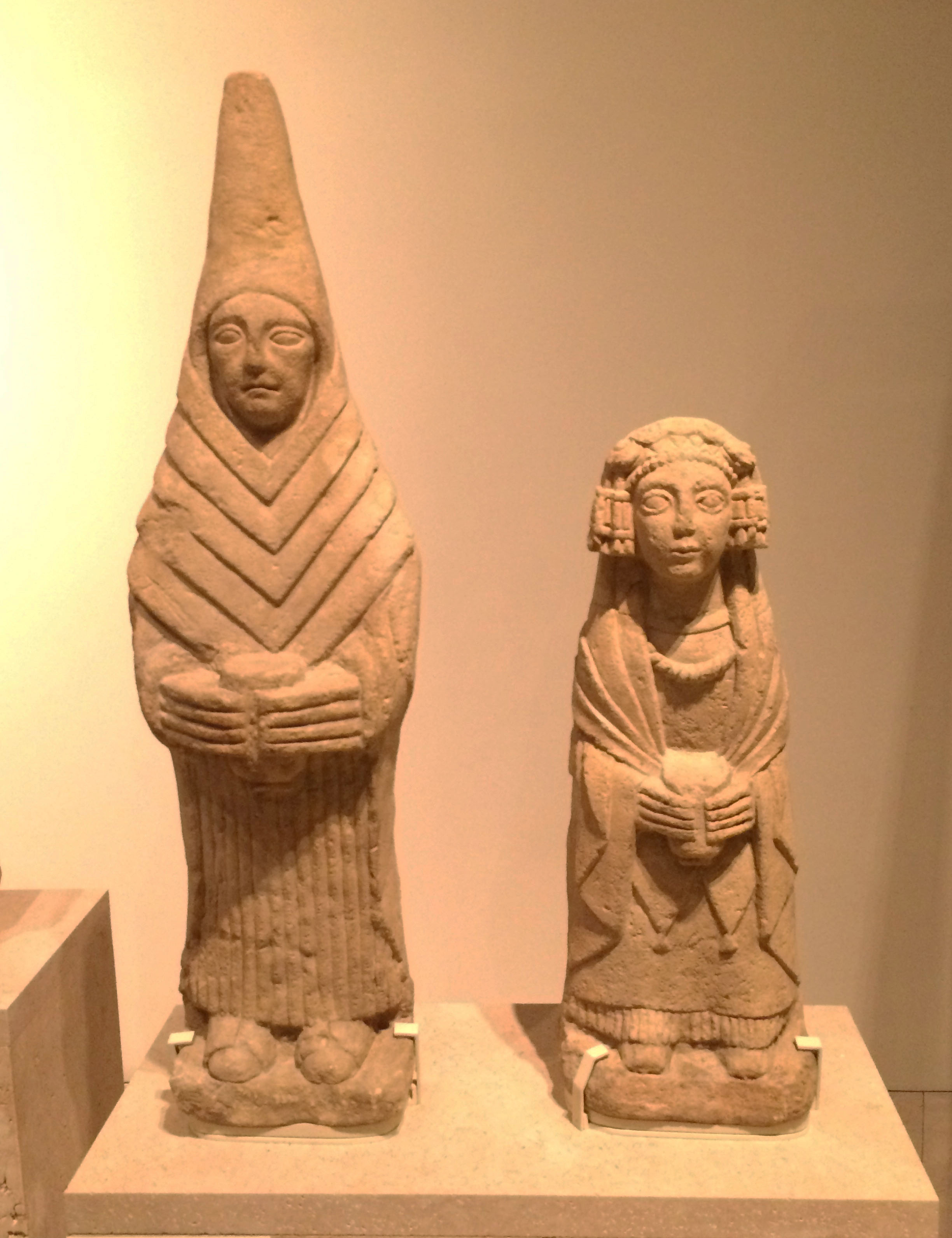 These offering bearers made from limestone are the most common type of representation found at the ancient Iberian Shrine of Cerro de los Santos (Montealegre de Castillo, Albacete) in Spain. These specimens date from the 3rd-2nd century BCE. They are usually women, although the odd male figure can be found too. They are always richly garbed and hold an offering vessel in both hands. (Museo Arqueológico Nacional, Madrid)