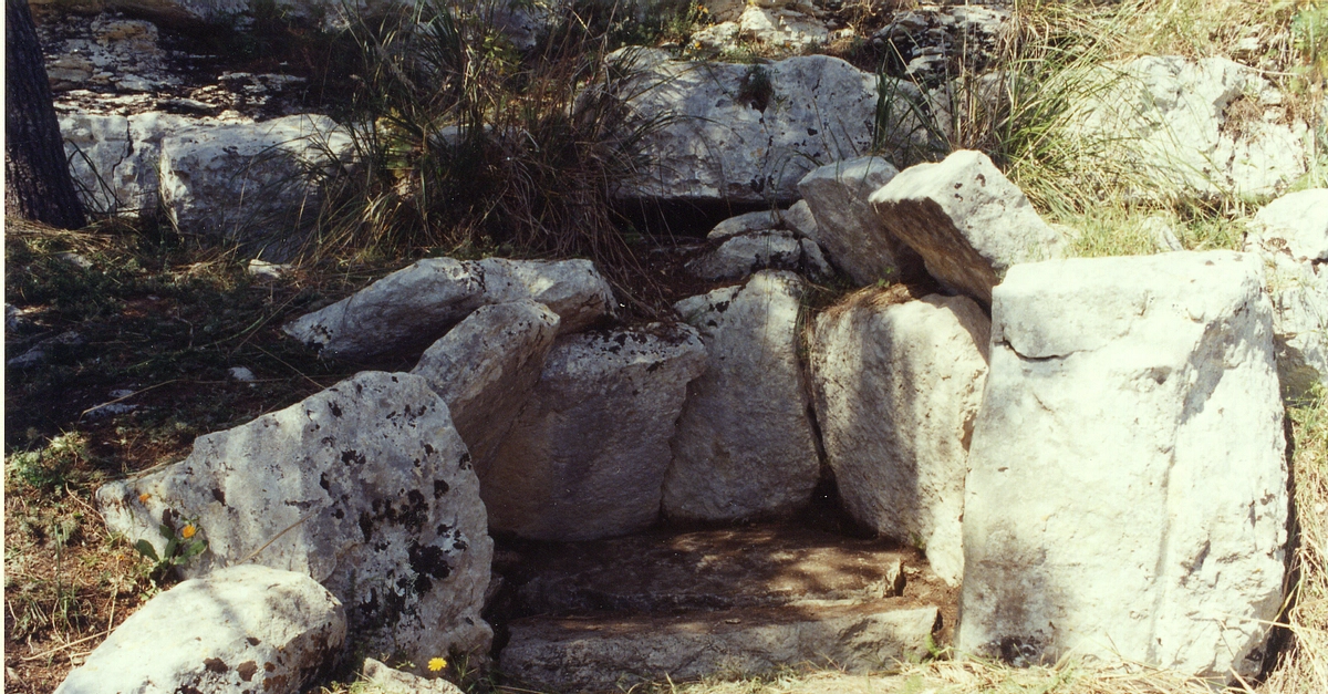 The Dolmen of Cava dei Servi, a few kilometers from Modica, in Sicily. It is a semi-oval monument formed by four rectangular slabs fixed into the ground and three slabs on top, leaning in such a way they reduce the surface and form a false dome. Two large parallel-piped boulders complete the construction. Inside of it, found by the author, were human bone fragments (the only organic clues so far found inside a Mediterranean dolmen) and some splinters of Castelluccian ceramics (Early Bronze Age) , which confirmed the burial purpose of the artefact and legitimised dating them back to the Sicilian early Bronze Age (c. 2200-1450 BCE).