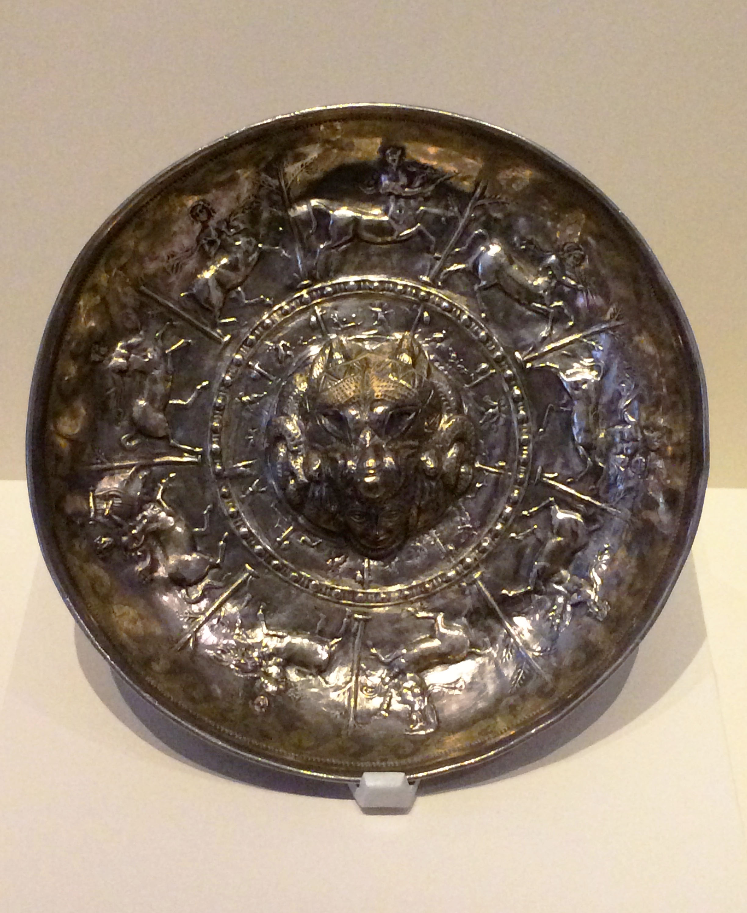 This patera for libations dates from the second half of the 3rd-early 1st cetury BCE, and it was found in the ancient Iberian Perotito Hoard. Made out of sheet silver with repoussé decoration, the patera features a traditional Iberian scene of a wolf's head devouring a human head encircled by serpents. However, both the reliefs of centuars and centaurides holding musical instruments at a nocturnal baquet and the erotes with trophies are inspired by the Late Hellenistic world. It is thought to be the work of a local craftsman. (Museo Arqueológico Nacional, Madrid)