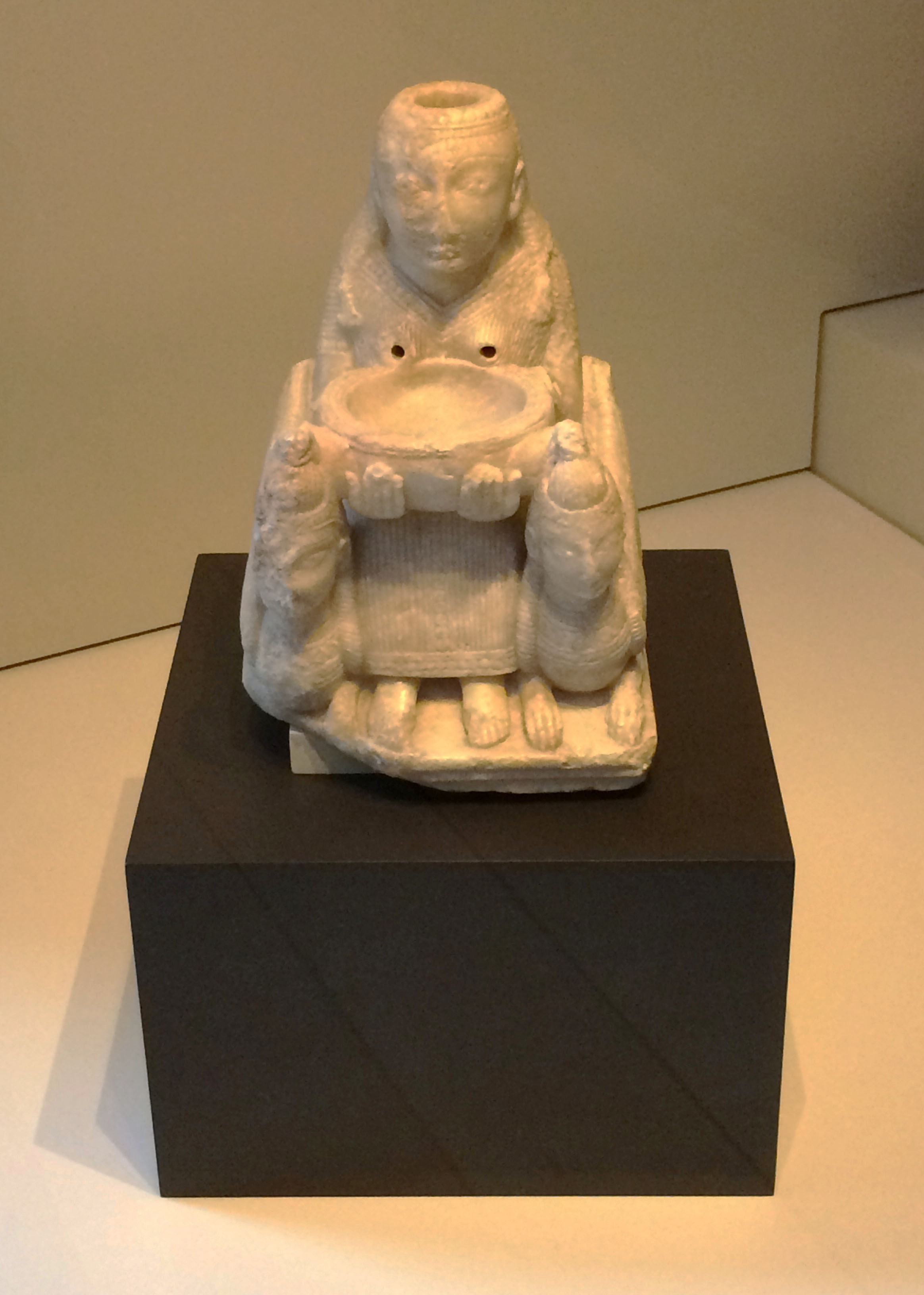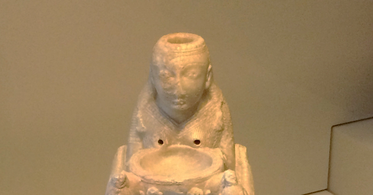 Made of alabaster, the "Lady of Galera" comes from the Necropolis of Tútugi, Zone I, Gave 20 (Galera, Granada) in Spain. This sculpture of an enthroned goddess is identified with Astarte. It was designed as a ritual container with a hollow head and bust for holding the sacred scented oil that was used to anoint the dead and thus ensure deification in the afterlife. Made at a Syrian-Phoenician workshop in the early 8th century BCE, it was reused by several generations before finally being deposited in a royal Iberian tomb identified as that of the founder of Tútugi in the late 5th century BCE. (Museo Arqueológico Nacional, Madrid)
