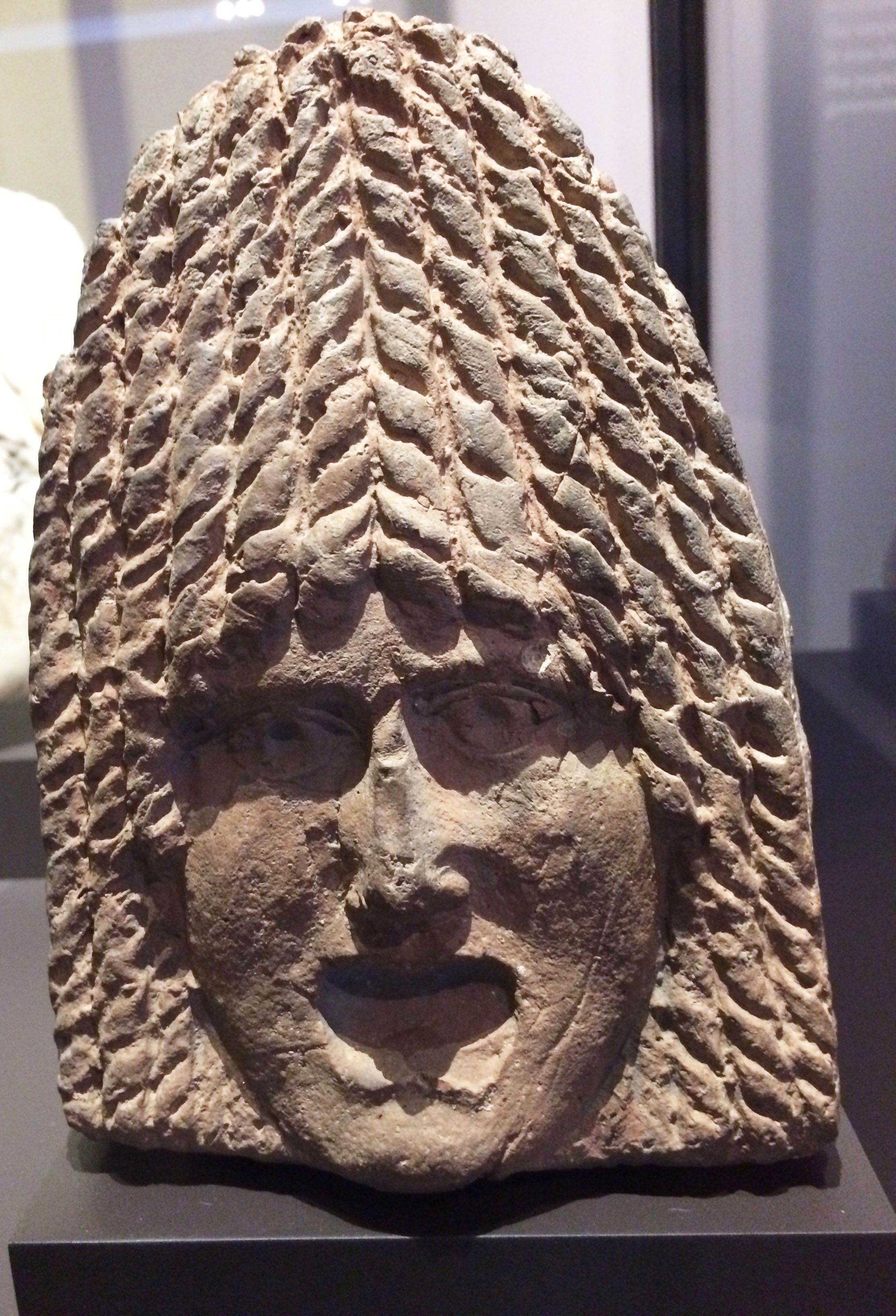 This Hispano-Roman tragedy mask was originally an architectural element made of clay. It dates from the 1st-2nd century CE, and it was found at Bañuelas (Ávila), Spain. (Museo Arqueológico Nacional, Madrid)