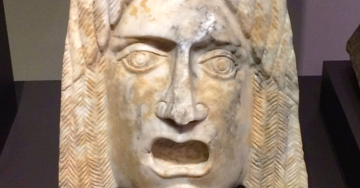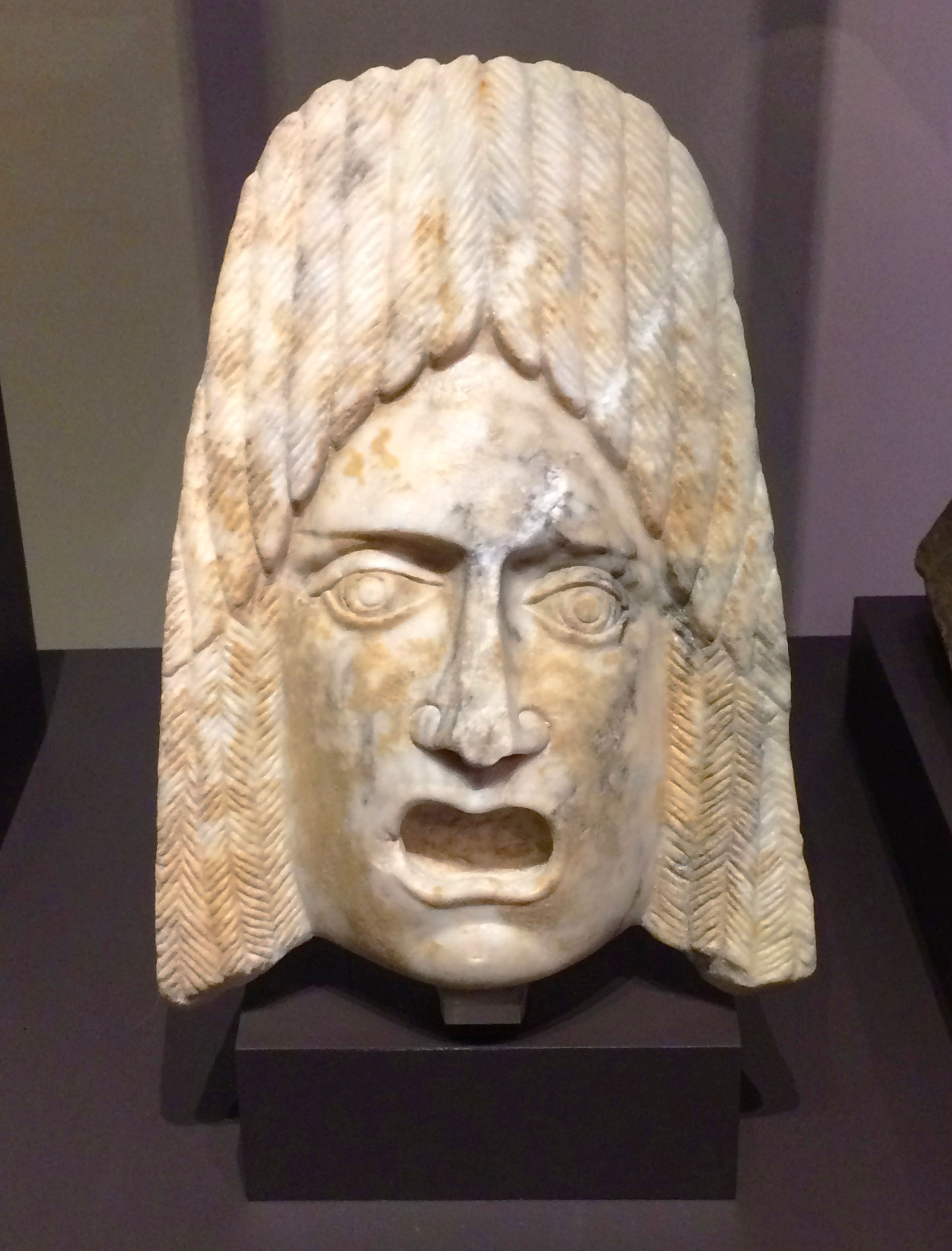 This Hispano-Roman tragedy mask was originally an architectural element made of marble. It dates from the 1st-2nd century CE, and it was found at Bañuelas (Ávila), Spain. (Museo Arqueológico Nacional, Madrid)