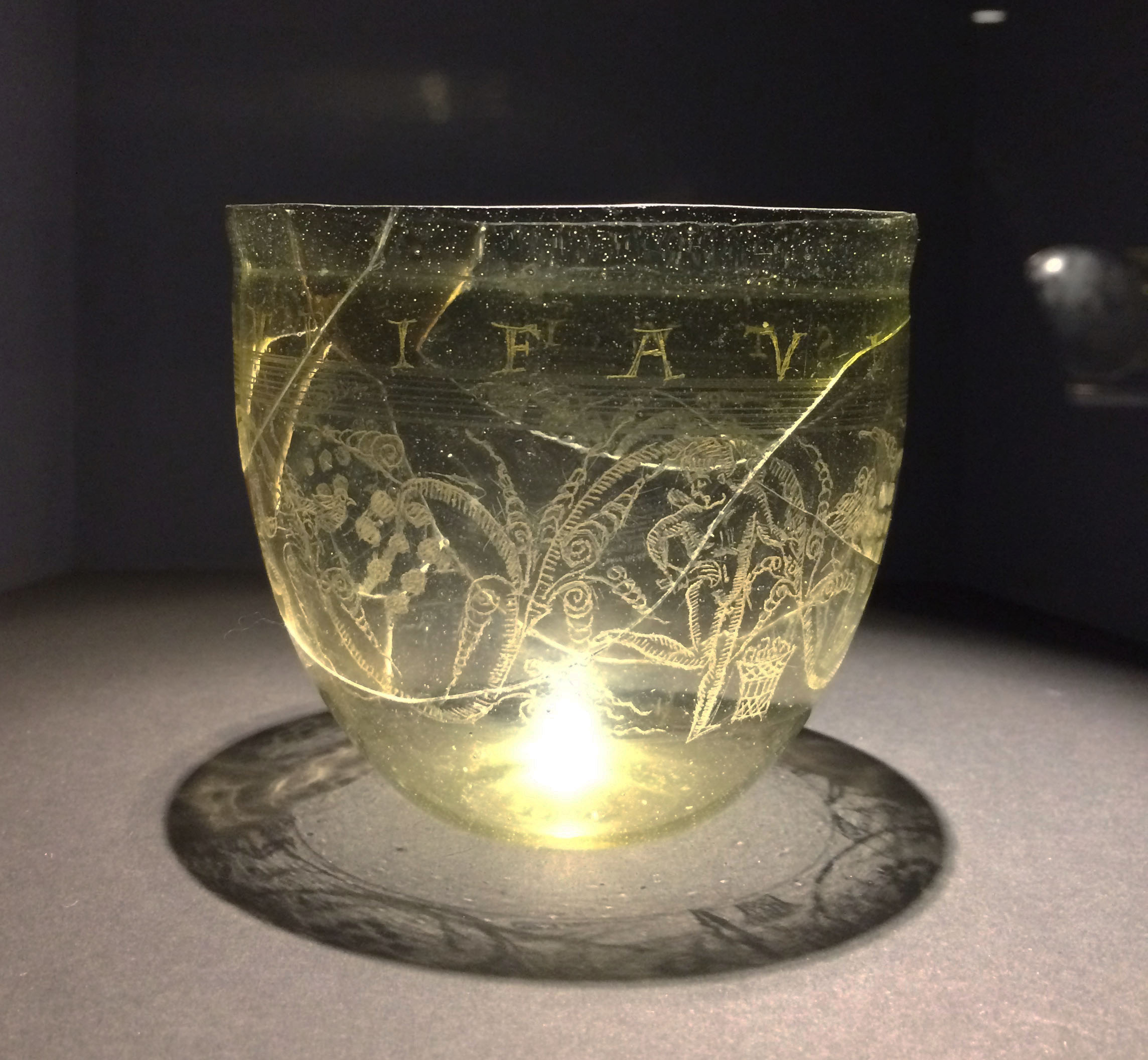 A dedication is incised on the rim of this Roman beaker made of glass: "MERVEIFA VIVAS TVIS." (Translation from Latin: "Merueifa, may you live among your own.") Beneath the inscription are naked, winged boys harvesting grapes, watched by owls and vineyard birds. This beaker was found in 1882 in a Germanic burial ground in Leverkusen-Rheindorf, Germany, and it dates from the 3rd century CE. It was probably made on commission by a Cologne workshop. However, it is unusual in its shape and with regard to the personal dedication. So far, Merueifa is the only woman and the only Germanic woman to have such a vessel dedicated to her in the Cologne area that archaeologists know of at this time. Since the elite on the right bank of the Rhine River cremated their dead, very few grave goods like this beaker have survived. (Römisch-Germanisches Museum, Cologne)
