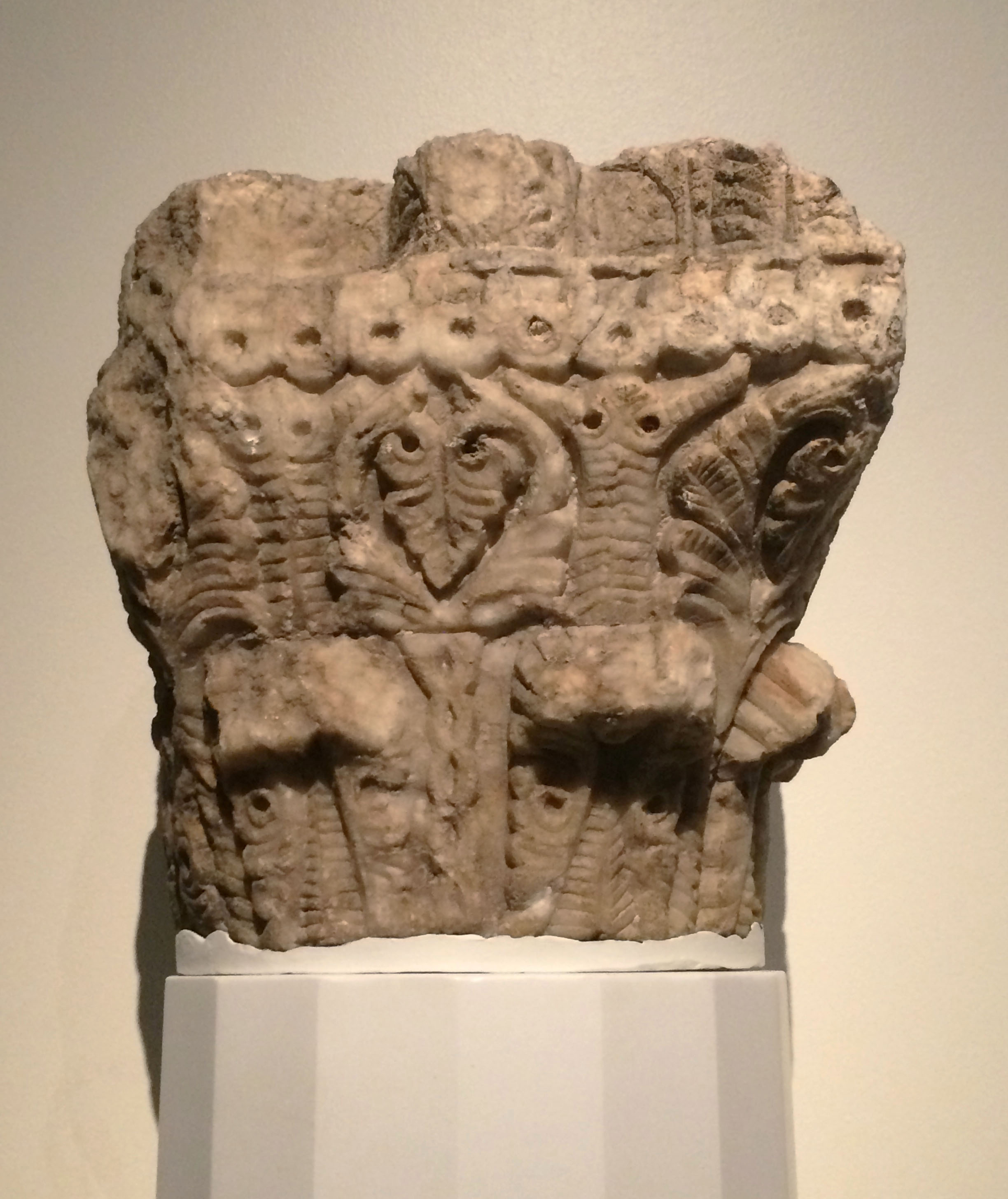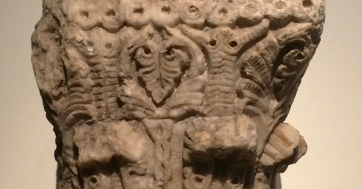 The half-palmettes on this column capital made from marble are ultimately derived from ancient Assyrian models. Stylization transforms its more recent Hellenistic predecessors. This specimen dates from the late 7th-early 8th century CE. (Aga Khan Museum, Toronto)