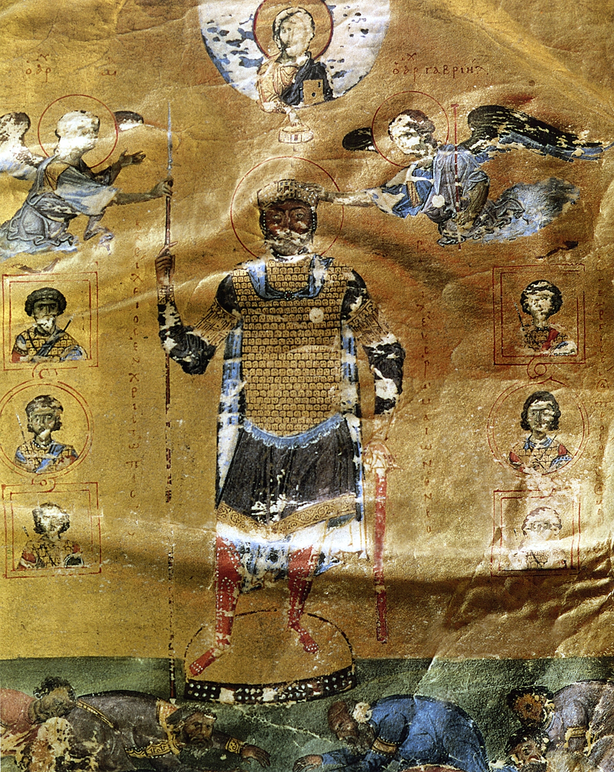 An early 11th century CE depiction of Byzantine emperor Basil II (r. 976-1025 CE) being crowned and armed by archangels. He is being blessed by God from above and worshipped by military saints on both sides. Below, courtiers and defeated enemies bow in submission. Frontispiece of the Psalter of Basil II. (Biblioteca Nazionale Marciana, Venice, Italy)