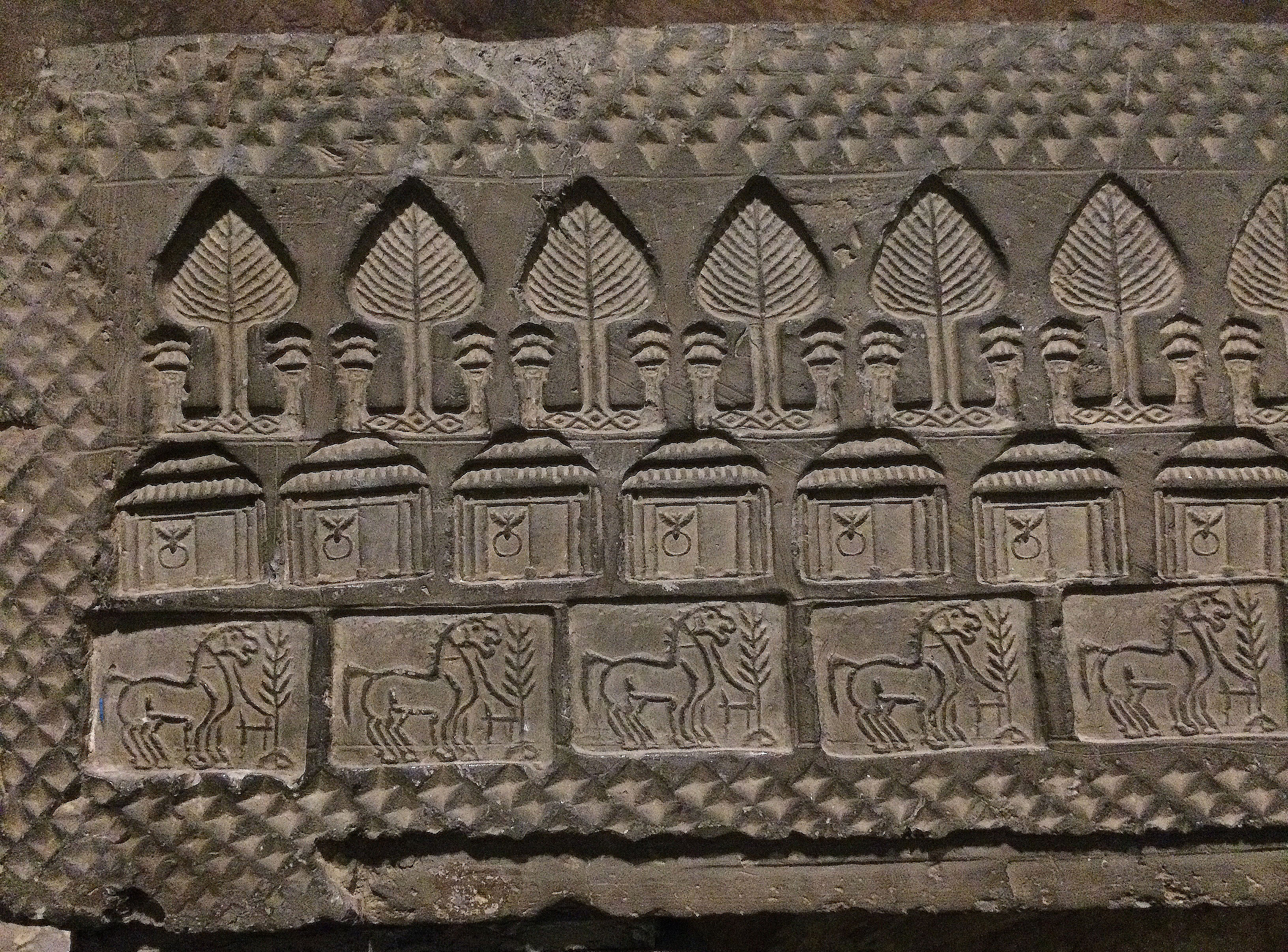 This is an ancient Chinese brick from a tomb doorway, which was created during the Han Dynasty (206 BCE-220 CE) and made from clay. This brick shows trees, tomb doorways, and tethered horses. (Victoria & Albert Museum, London)