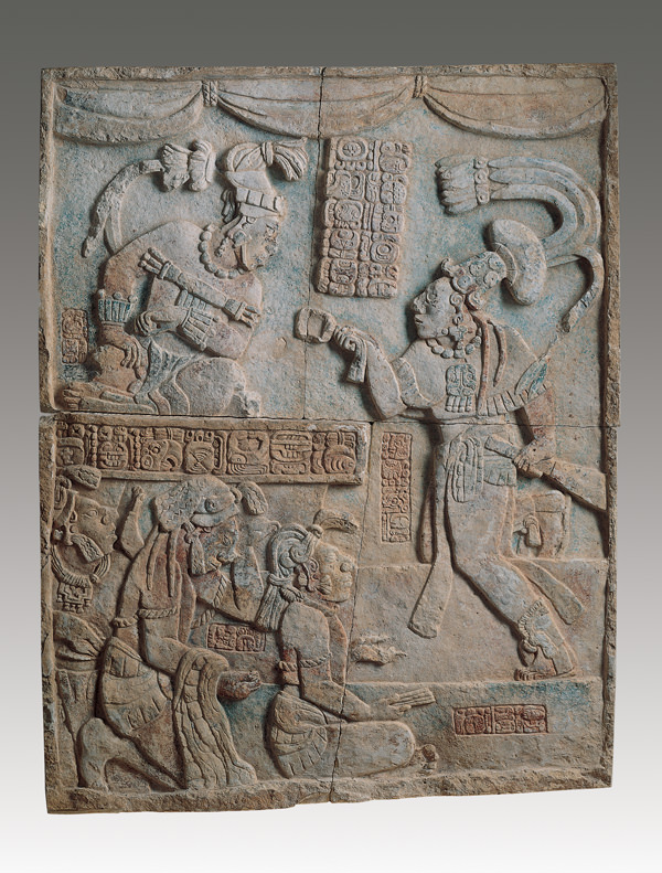 This carved limestone relief, dated 23 August 783 CE, depicts three scribes being presented as prisoners to a Maya ruler. The captives are identified as scribes by the stick-bundle the first one holds (the traditional implements of scribes) and by their headdresses. Scribes were highly prized as prisoners as they were the ones who recorded the great deeds of the ruler. When a ruler was defeated the fingers of his scribes were broken. The fact that the piece is signed by the artist suggests the importance of the event depicted, the status of the artist, or both, as Maya art is rarely signed. The relief is presently in the Kimbell Art Museum, Fort Worth, Texas.