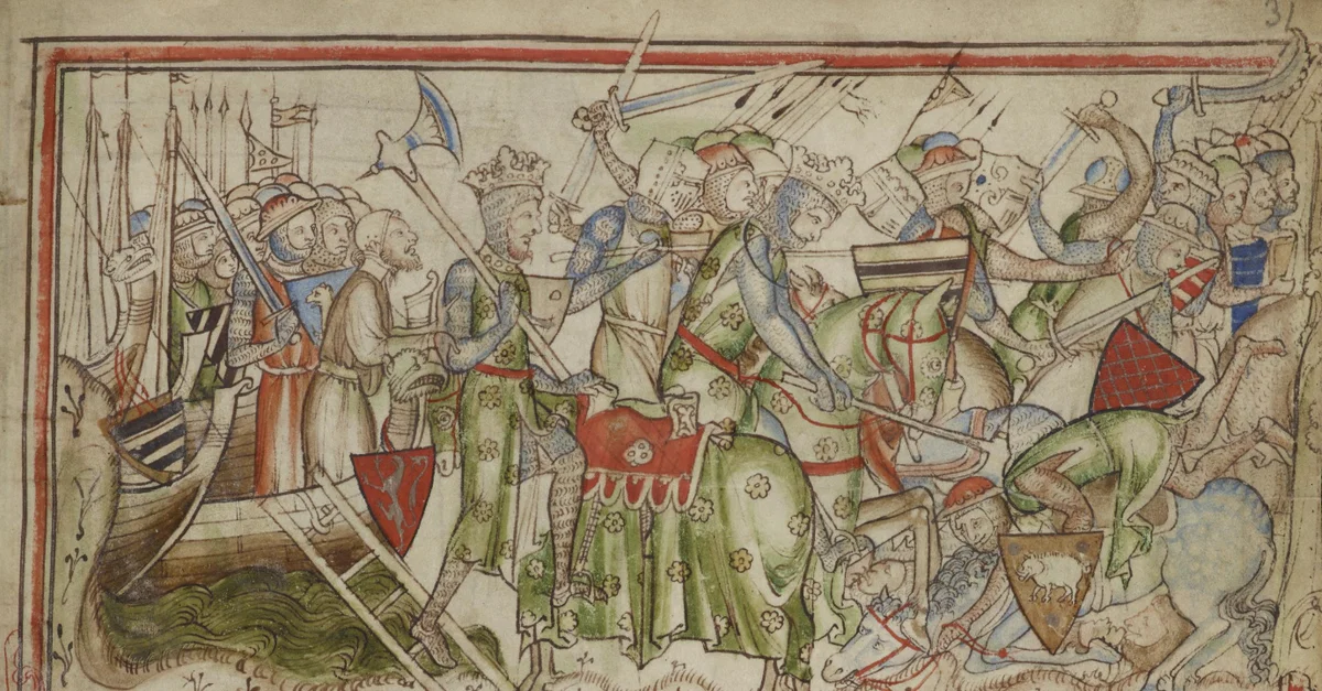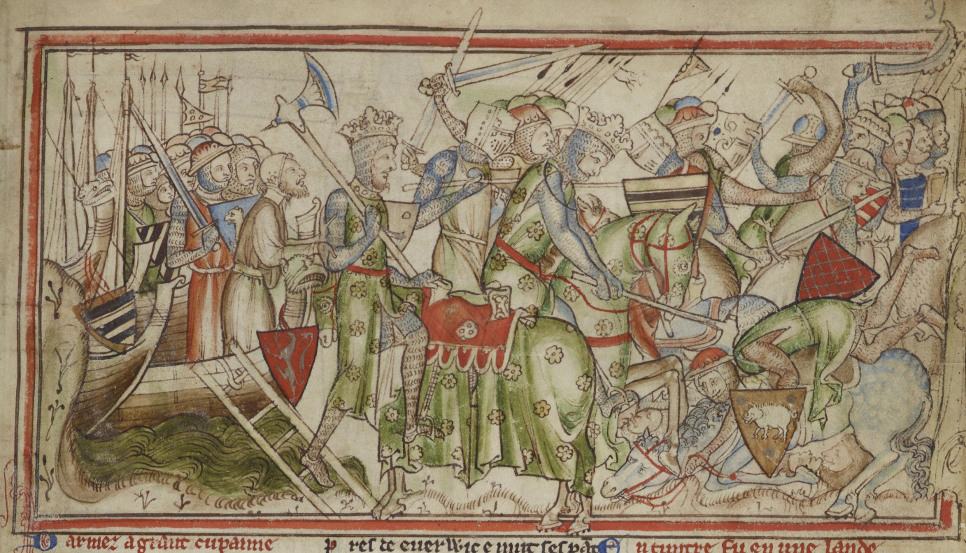 A 13th century CE depiction of the Norwegian king Harald III, aka Harald Hardrada (r. 1046-1066 CE) at the Battle of Fulford Gate on 20 September 1066 CE. (From "The Life of King Edward the Confessor" by Matthew Paris).